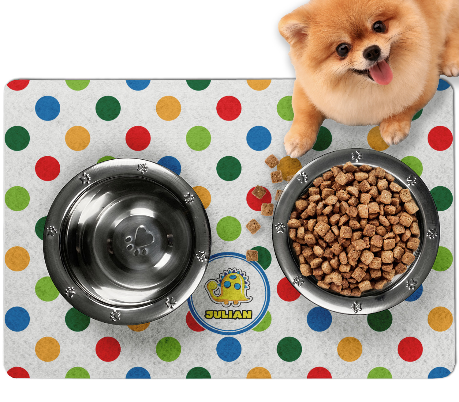 This dog bowl mat, fabricated from polyester, proudly displays your customized design on its top, while its bottom includes a non-slip rubber. This feature allows it to remain firmly in place, even when your dog spills his/her water. With 3 sizes available (18" x 12", 24" x 18", 30" x 24"), the pet food mat has ample space for both a food and water bowl for any sized dogs. Though specified for dogs' use, these mats are also a splendid option for cats.