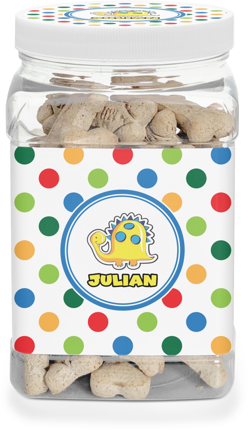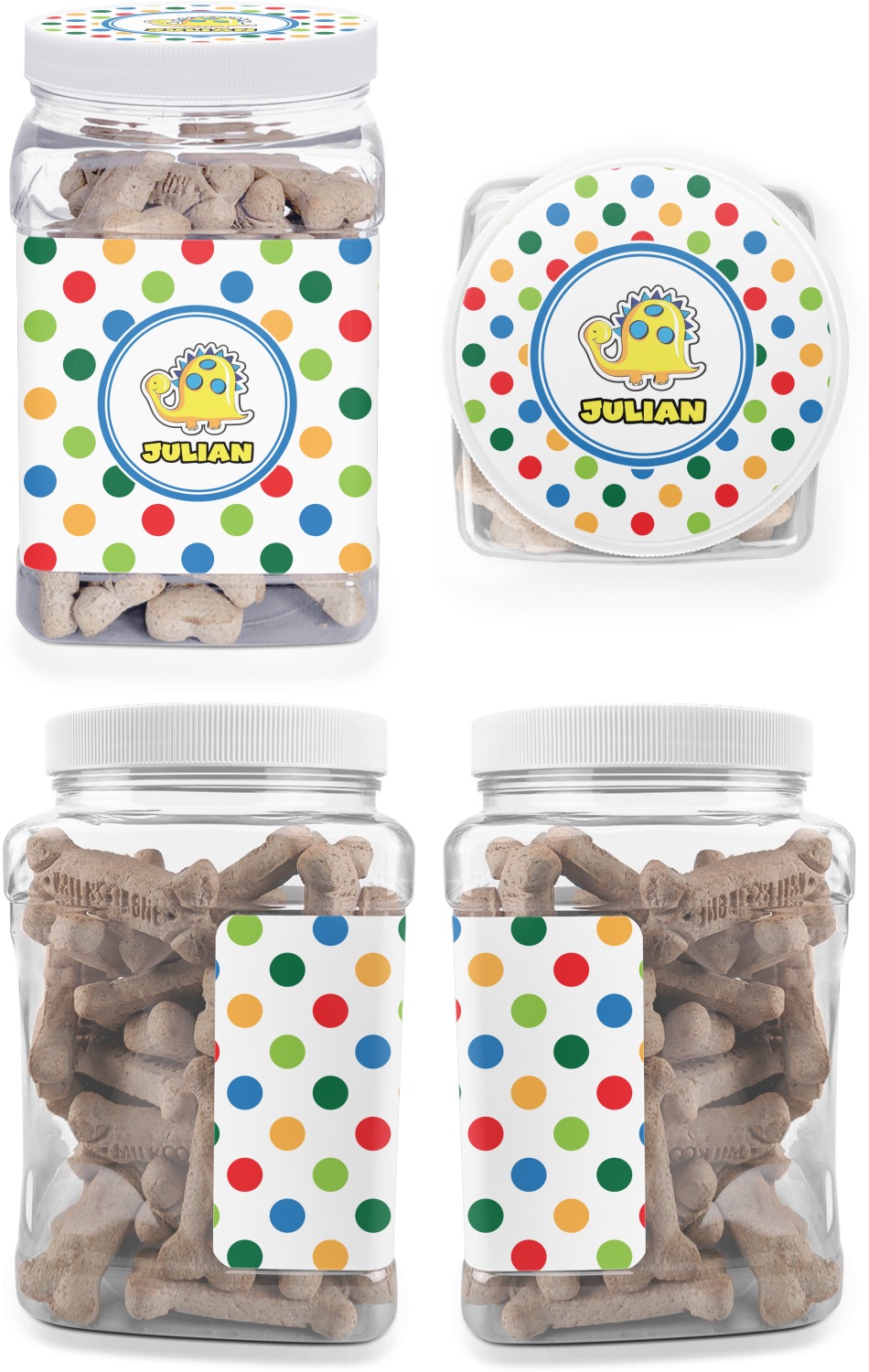 This half gallon jar, made from a sturdy plastic, is the perfect way to keep treats from any naughty pet paws, while still keeping them ready on hand for when your pup performs an impressive trick. This dog cookie jar features a screw-on, white lid that displays your personalized design on a vinyl sticker. We apply another customized sticker that wraps around the front and sides of the jar. Our dog treat jar also has indentations on the rear ends of the sides, which allows for convenient handling, and its square frame allows for easy storage.