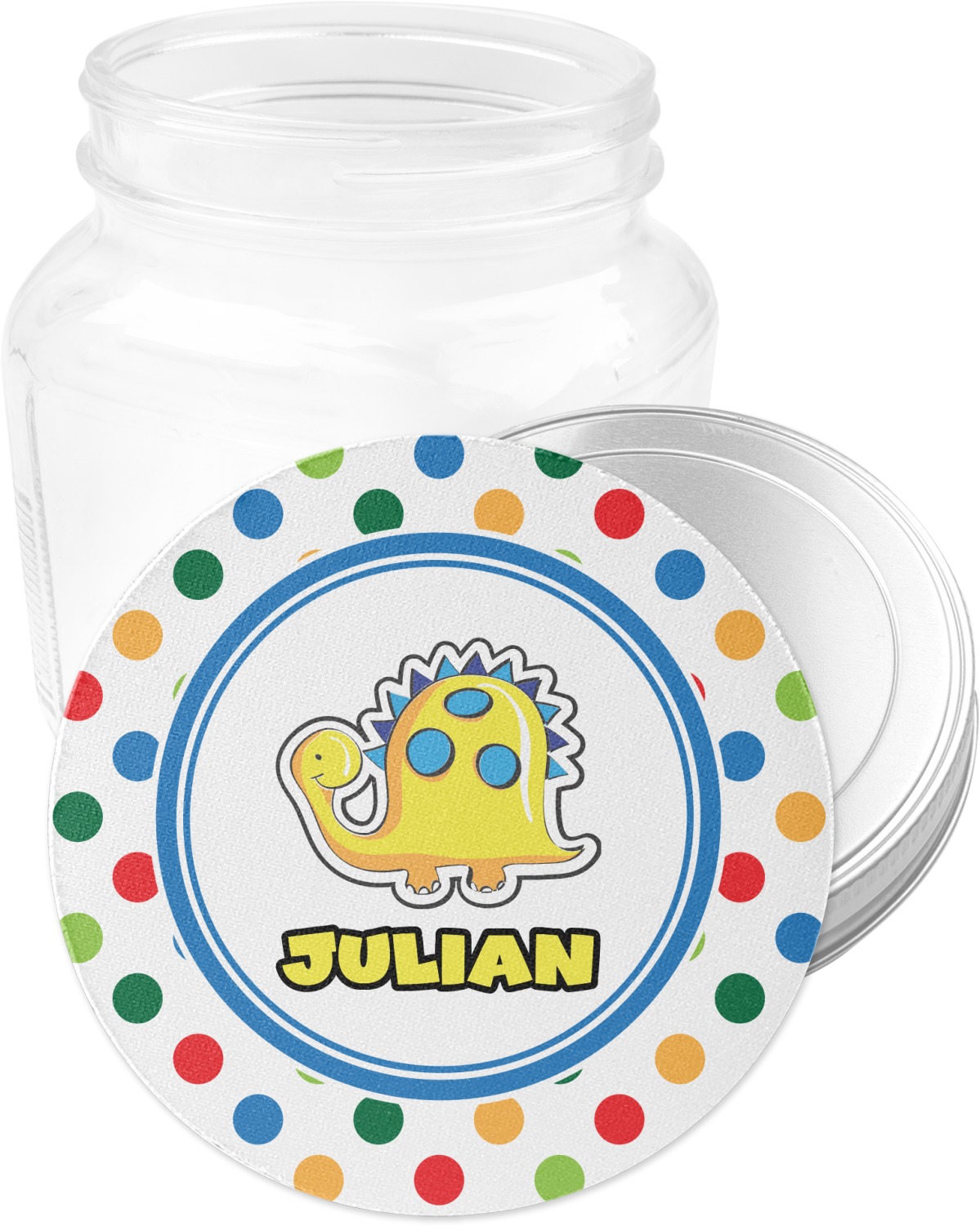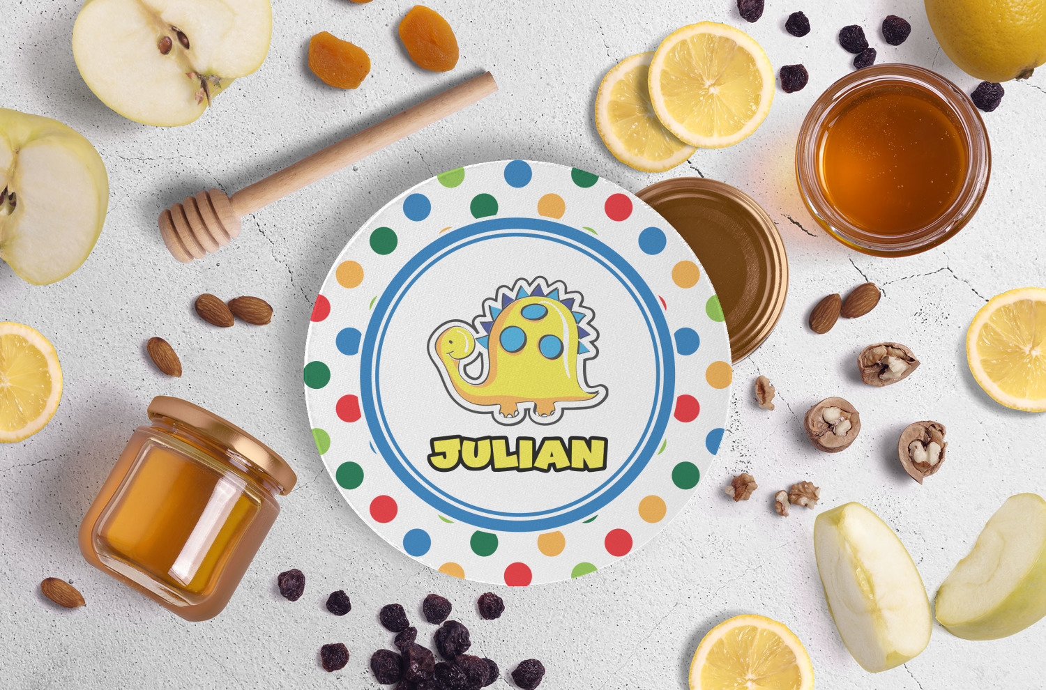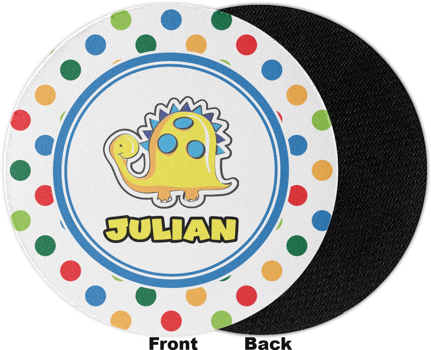 A white label trimmed in coordinating blue showcases a cute yellow dinosaur. Add personalization of your choice for this special pattern.