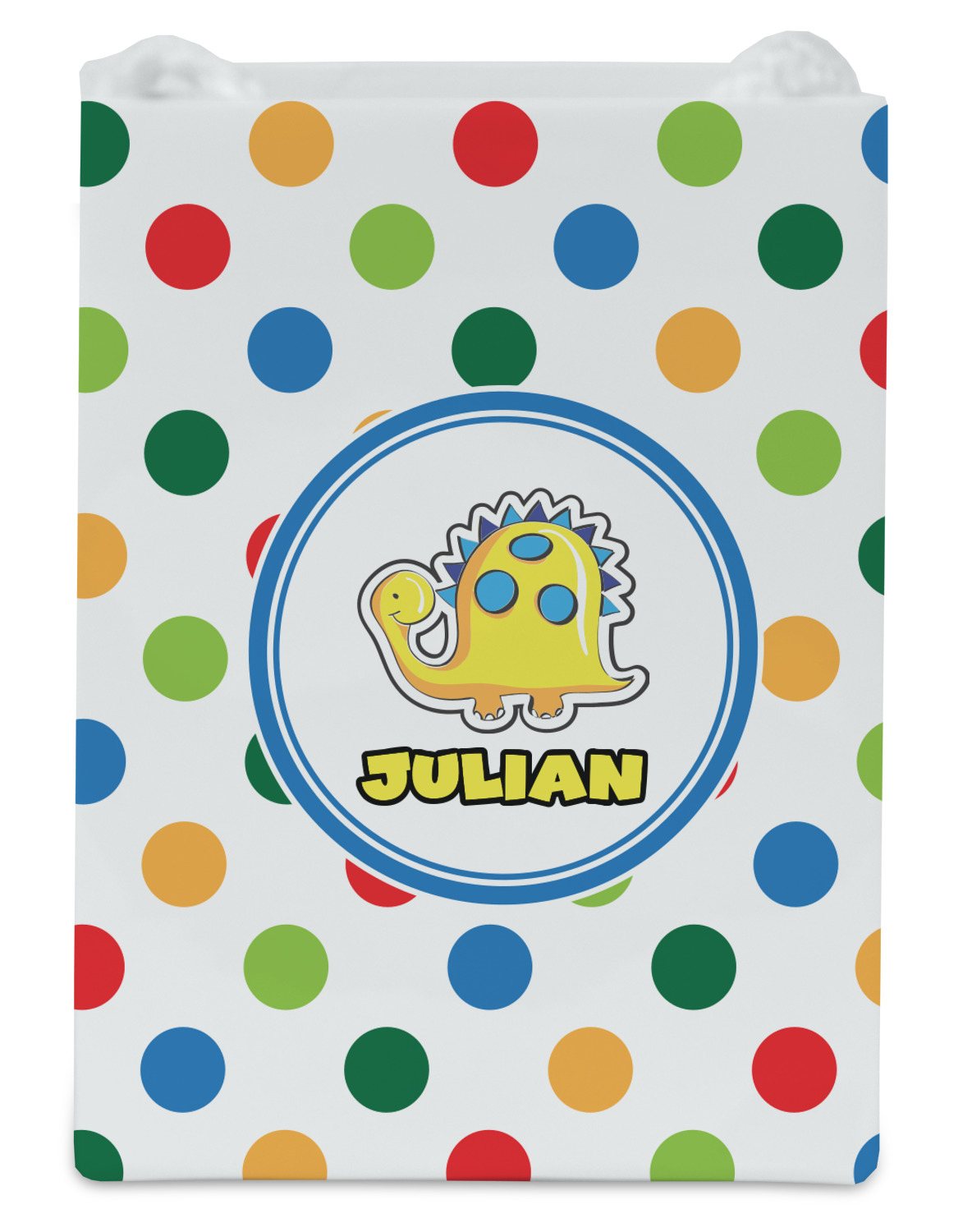 A white label trimmed in coordinating blue showcases a cute yellow dinosaur. Add personalization of your choice for this special pattern.