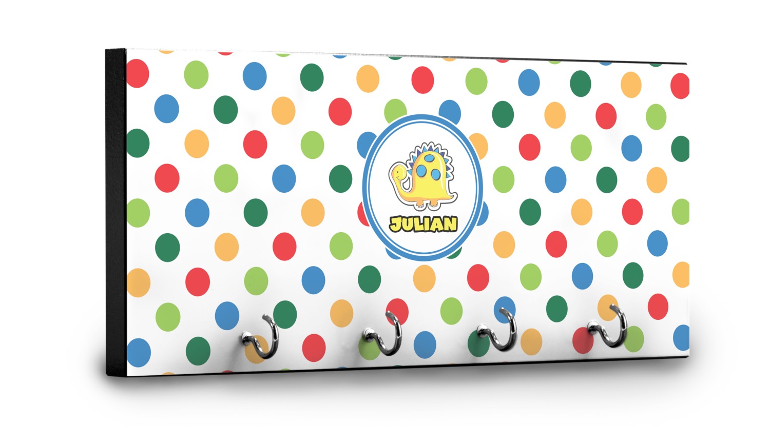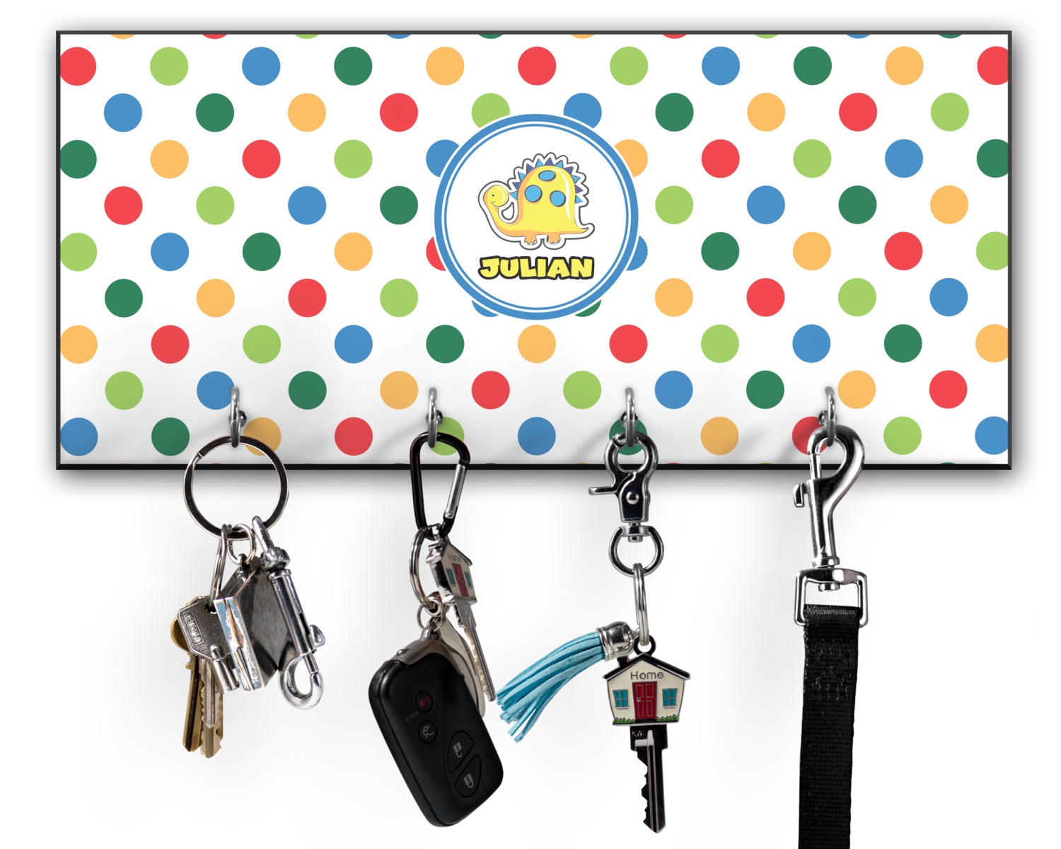 This 11" x 5" key hanger is made of sturdy wood and has four metal hooks lining the bottom. This is the perfect size for a family with several drivers. Not only can you hang keys on it though, but pet leashes and other small items. The board is black on the sides and back and is printed with the design of your choice on the front.