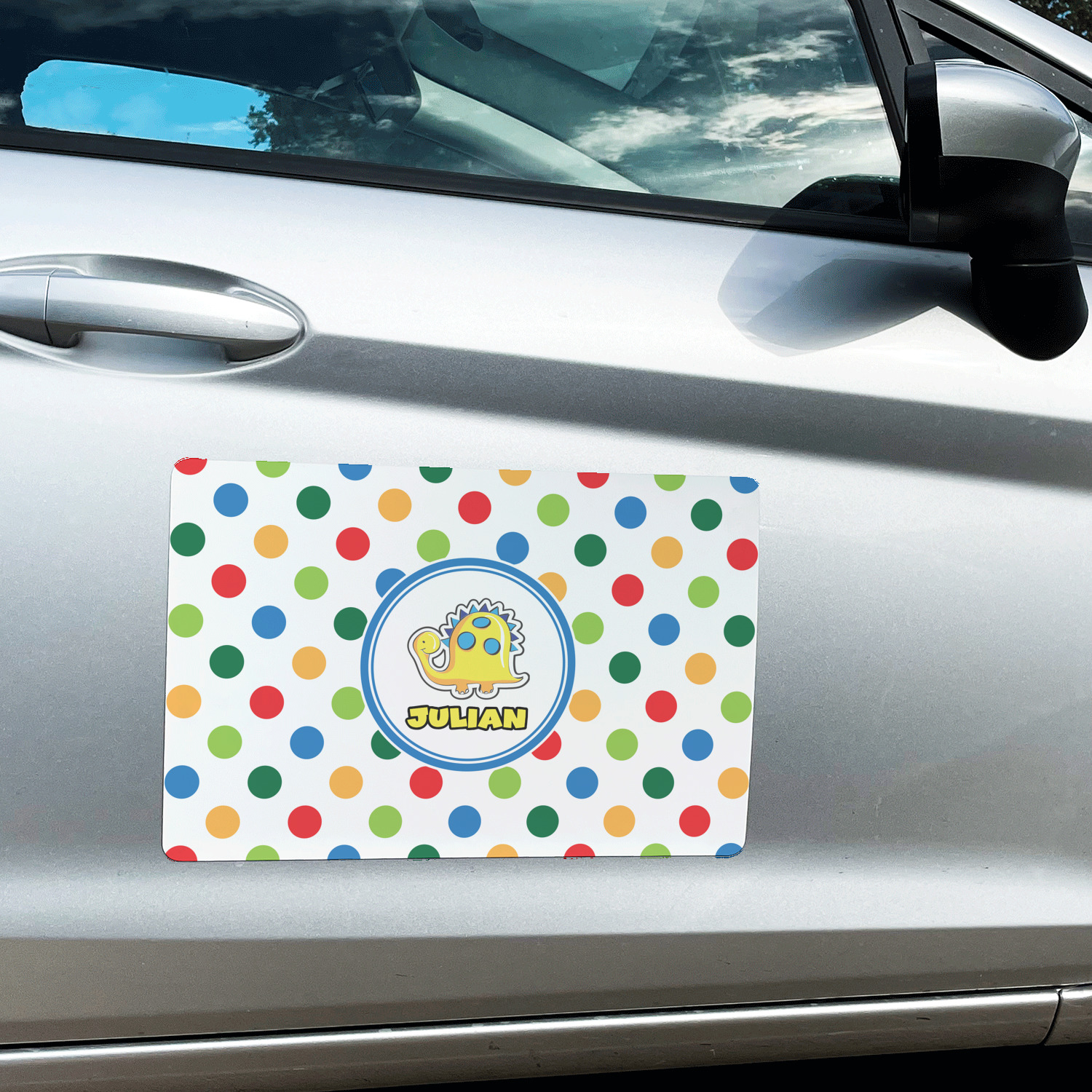 Your personalized large car magnet measures at 18 inches wide by 12 inches tall. They are 1 millimeter thick, which is considered, within the industry, as the ideal thickness for automobile magnets. The magnetic car decals will adhere to any smooth, ferrous metal surface of your cars body, such as the trunk door or a side panel.