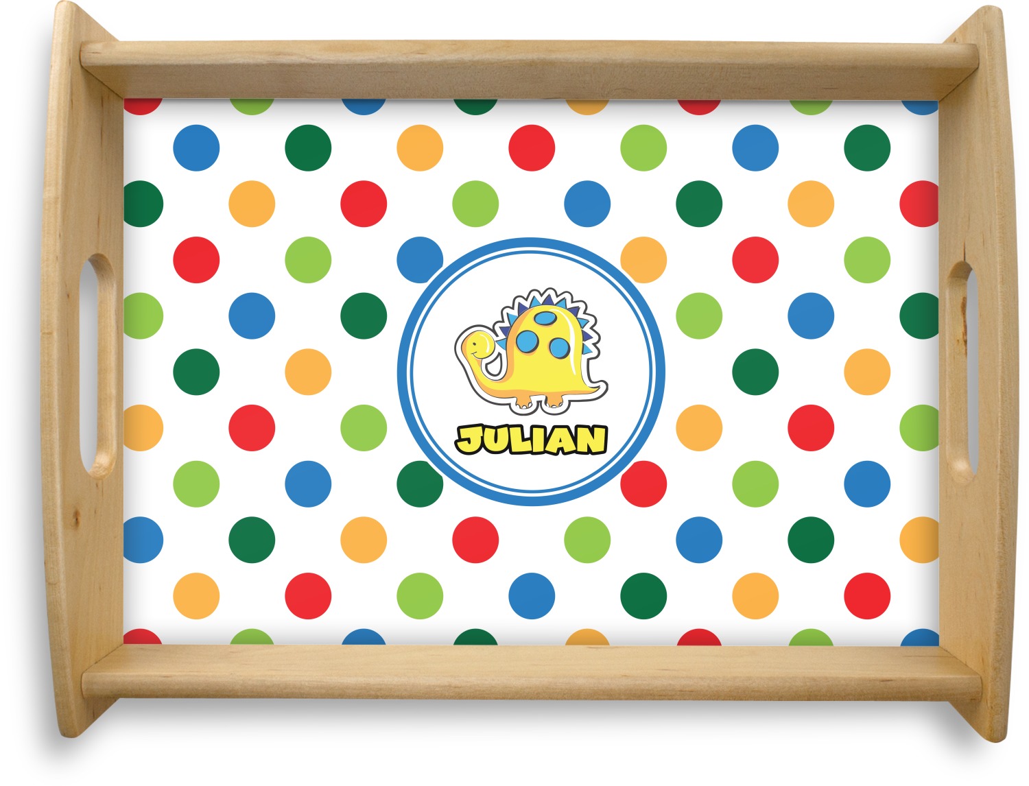 This serving tray with handles features square edges and two rounded sides, creating a very modern look. Each side is fabricated from a beautifully cut, natural wood. The bottom of the interior of the tray displays your customized design in bright, vibrant color. The tray is sold in both a black color and a natural wood look. Each variation of the wood serving tray has two sizes: Small, which is 14" x 10" x 2.25", and Large, which is 19.5" x 13.5" x 2.75".
