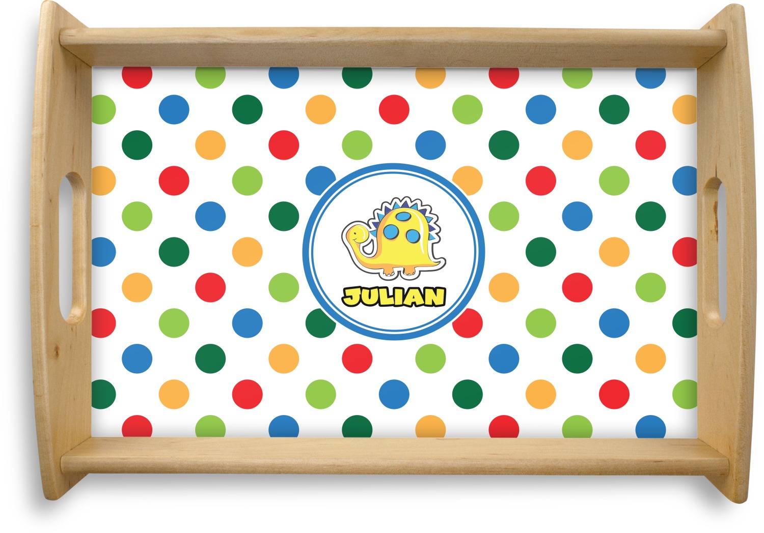 This serving tray with handles features square edges and two rounded sides, creating a very modern look. Each side is fabricated from a beautifully cut, natural wood. The bottom of the interior of the tray displays your customized design in bright, vibrant color. The tray is sold in both a black color and a natural wood look. Each variation of the wood serving tray has two sizes: Small, which is 14" x 10" x 2.25", and Large, which is 19.5" x 13.5" x 2.75".