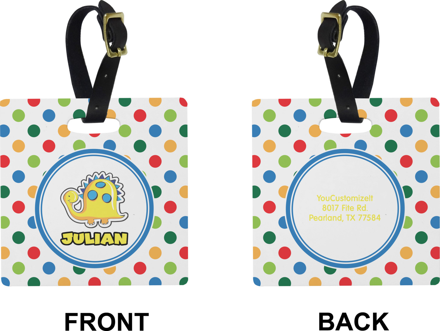 These cute luggage tags are made of a fiber-reinforced, UV-resistant plastic, making them waterproof and durable enough for both everyday use and the rugged adventures of any traveler! A leather strap with holes and a buckle is included with your purchase and can be used to attach your custom luggage tag to any suitcase, backpack, or duffel bag. You can design these travel tags as you wish; your customization will be displayed across the front, while the back will show as little or as much personal information as you want.