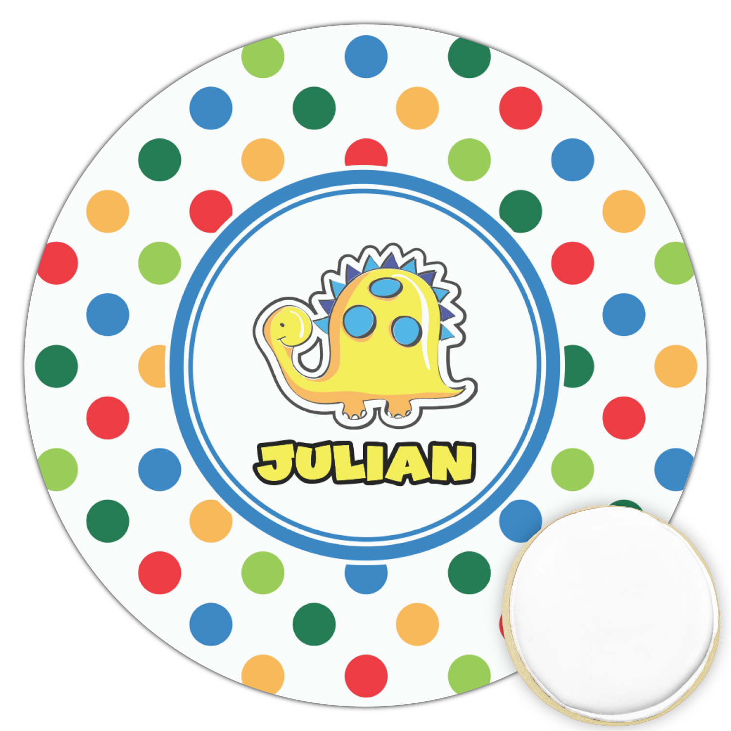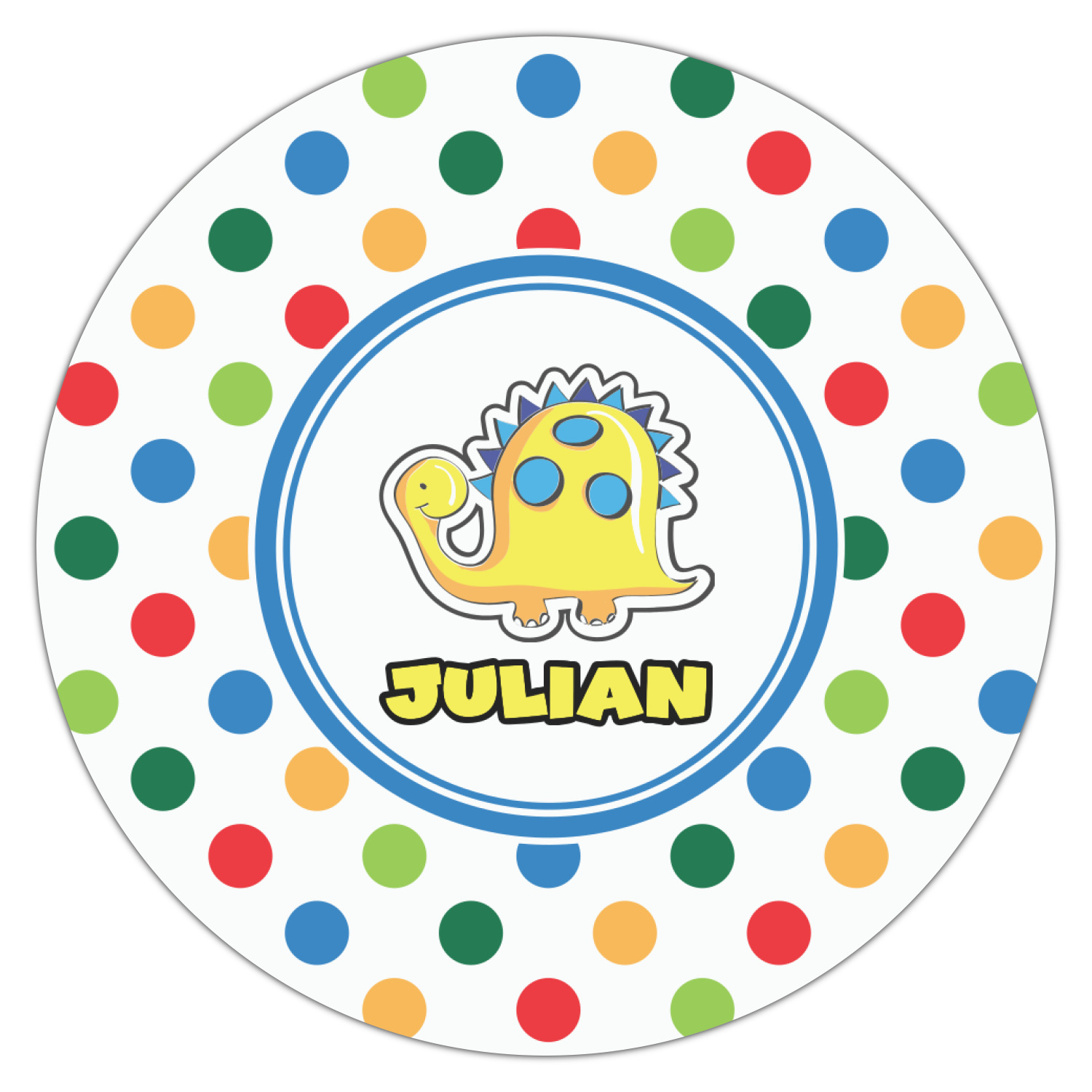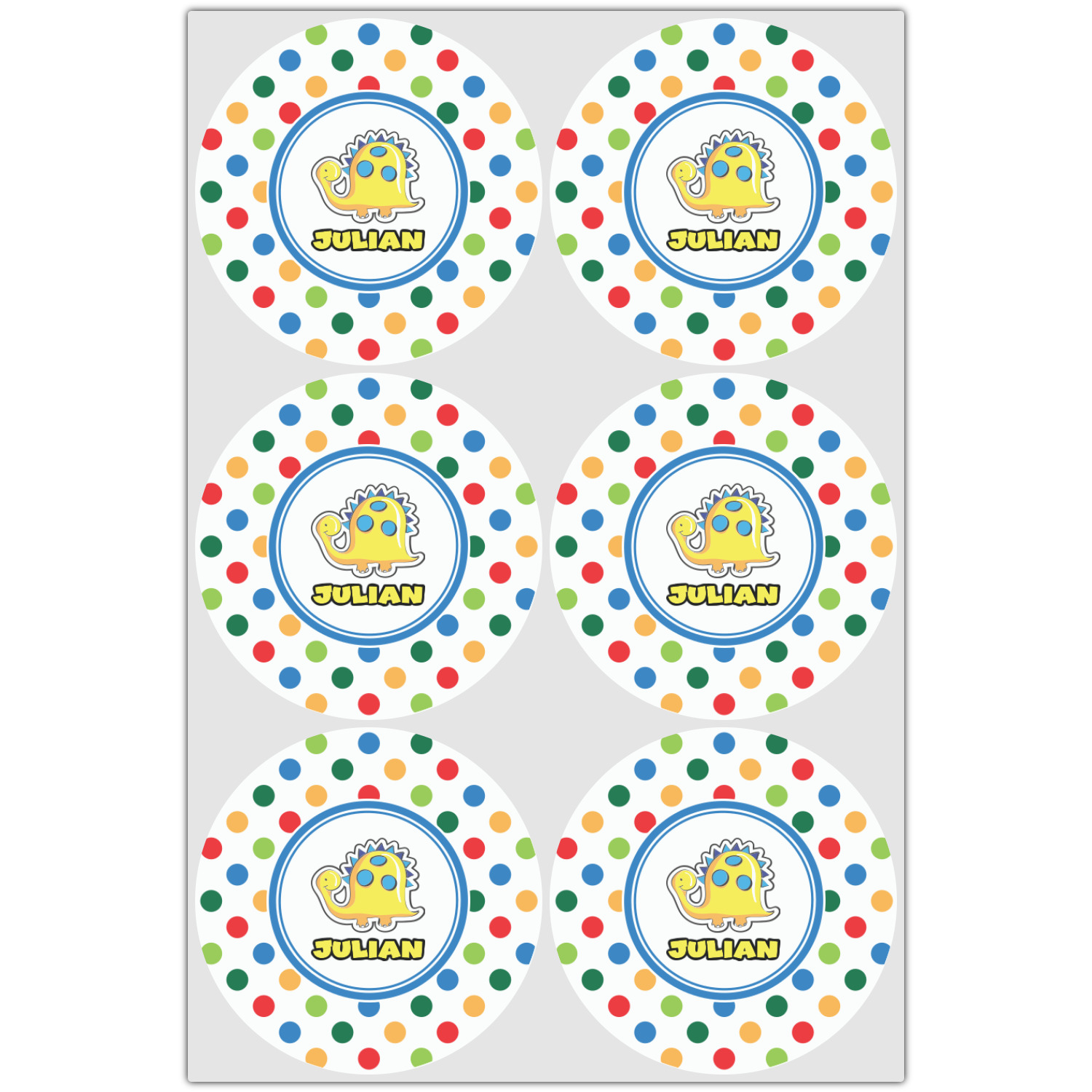A white label trimmed in coordinating blue showcases a cute yellow dinosaur. Add personalization of your choice for this special pattern.