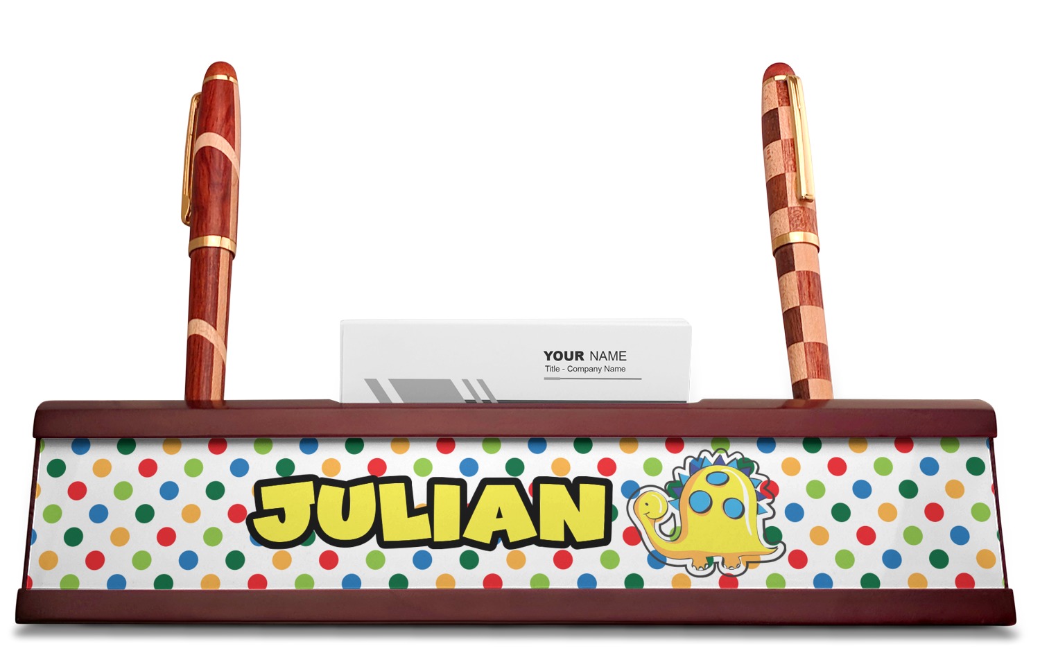 Your desk name plates are crafted from a high-quality, dark-cherry mahogany. At approximately 9.5 by 1.875 by 2.5 inches, this name plaque will fit perfectly, front and center, on your desk. Your customization spans across the entire face of the nameplate. Behind the nameplate lies a skinny slot that can fit approximately 15, traditionally-sized, business cards. You can also store your writing utensils on either side of this custom desk name plate.