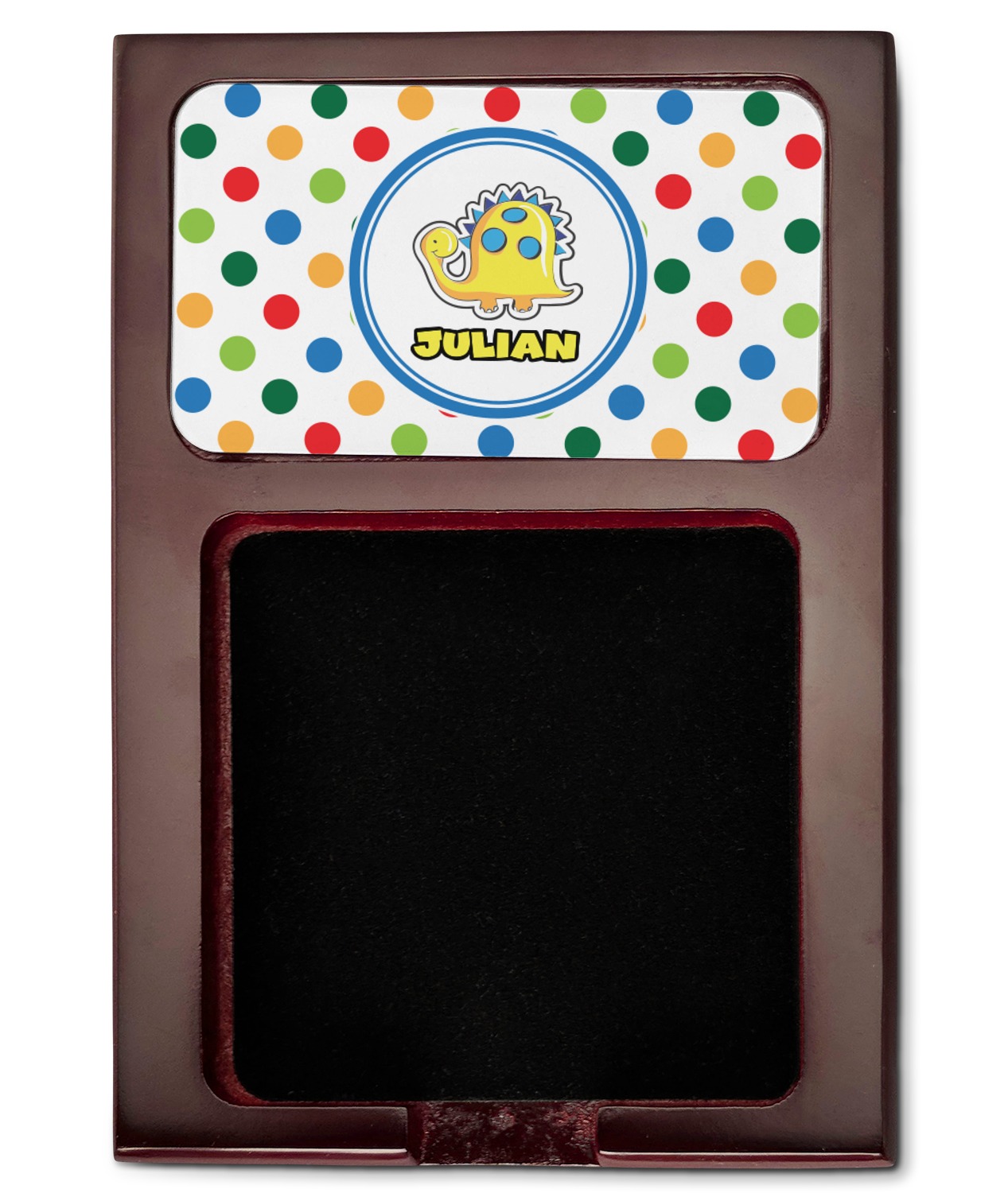 Crafted from a fine mahogany, this post it note holder is in the shade of a dark, cherry color. The dispenser itself is about 4.25 by 6.25 by 0.75 inches. You can place your 3 by 3 inch sticky notes in the indentation below the nameplate. We print your customization onto the nameplate that rests above the velvety indentation.