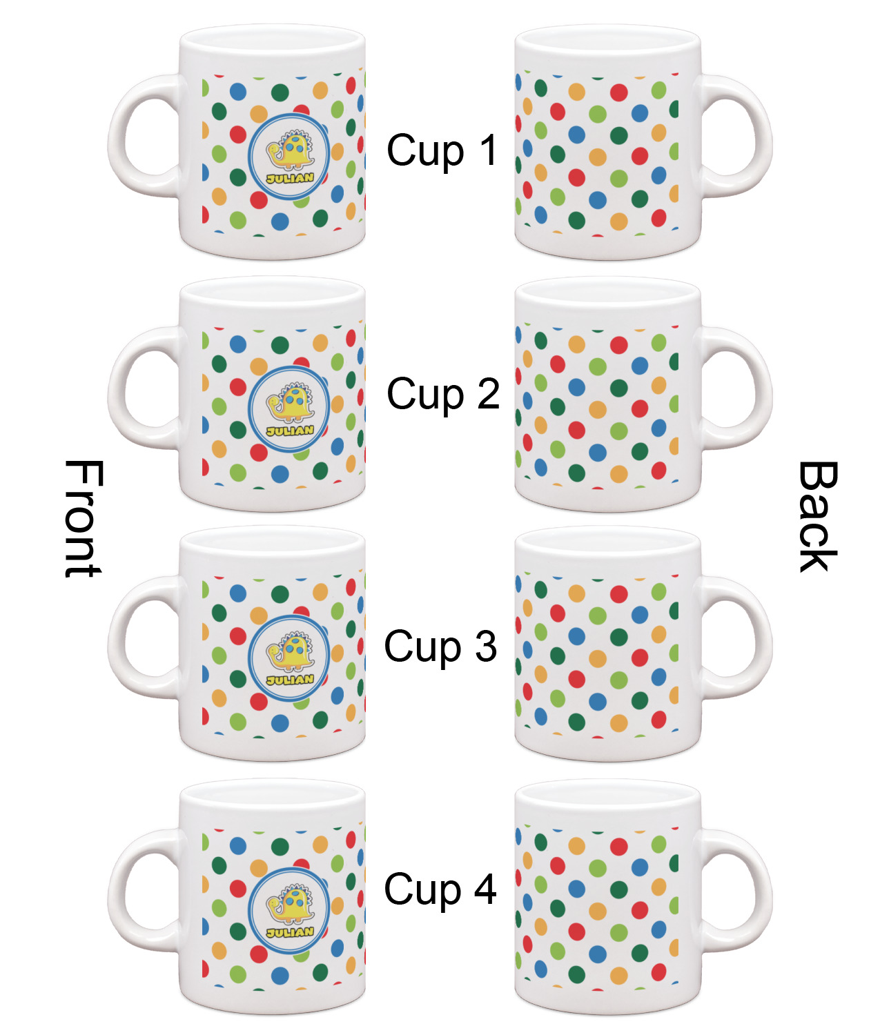 Each of our espresso mugs is a ceramic material sure to keep your drink warm. Personalize one cup for yourself, or order a set of 4! Its the perfect little gift for any coffee lover! We carry two sizes for you to personalize - 3 oz. (approx. 3.25" x 2.325" x 2.625") or 6 oz. (approx. 4" x 2.9" x 2.9"). Our 3 oz. mug is perfect for that single shot espresso while our 6 oz. mug can be your next favorite cappuccino cup holding two shots of espresso!