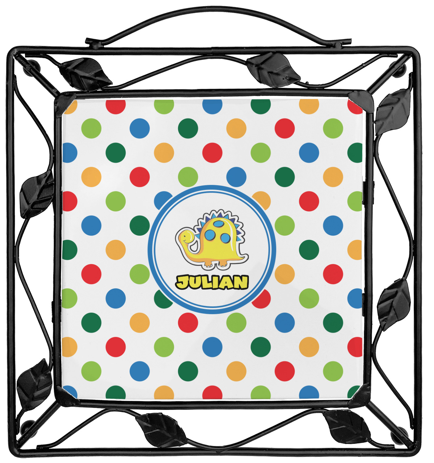 Our square trivets are made from a durable, wrought iron. This model features 4 small half circles, one on each corner, and a larger ring of iron that circles the central, customized tile. Each of the 4 corners has a round foot on its bottom for stability. This trivet is 8.75 by 8.75 inches, but the central tile measures at 6 inches on both sides.