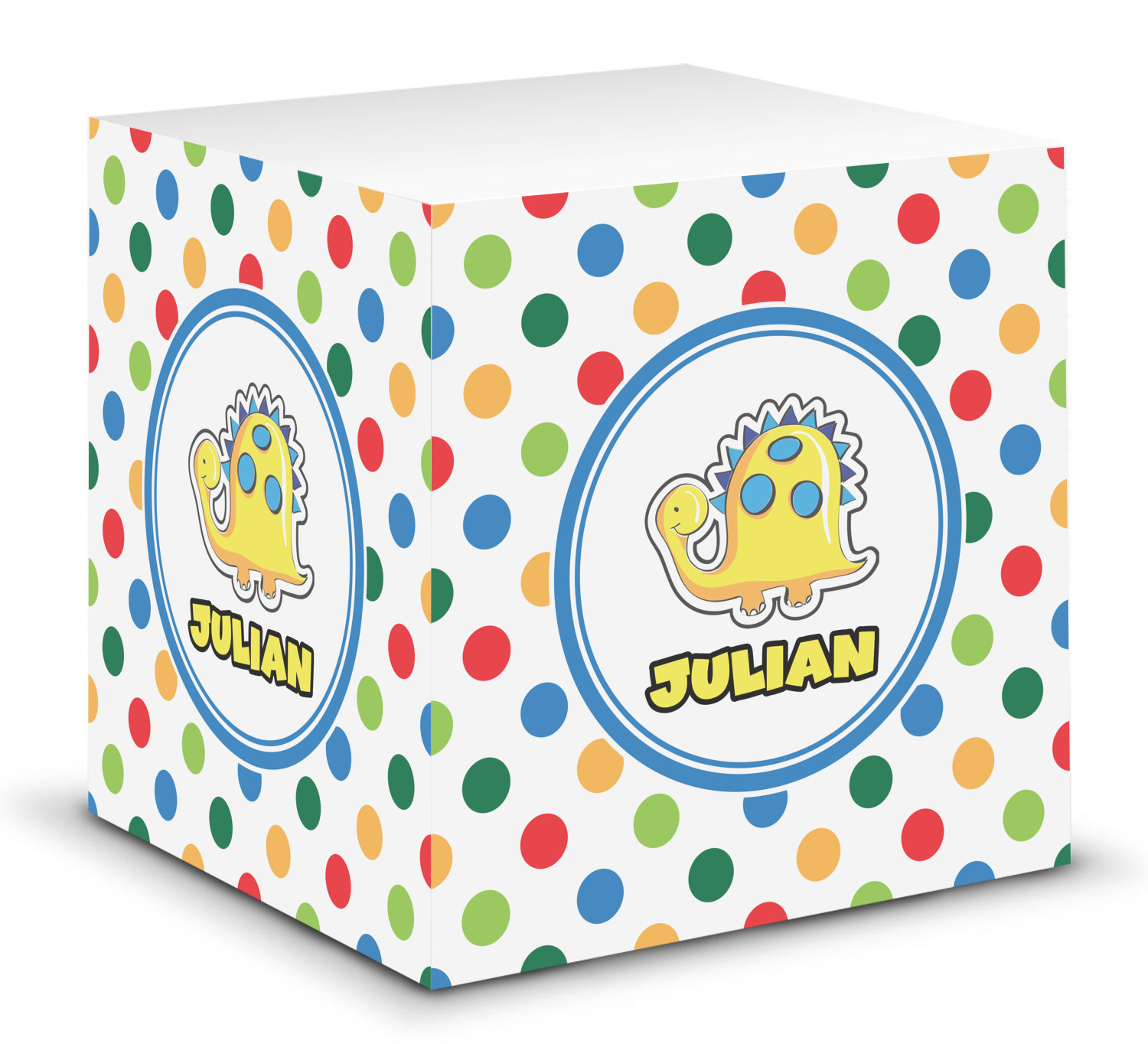This note cube features 700 sheets of matte, white paper. Each sheet measures at 3.5 by 3.5 inches and has an adhesive strip at its top. Your personalized design is displayed on all four edges of the sticky pad.
