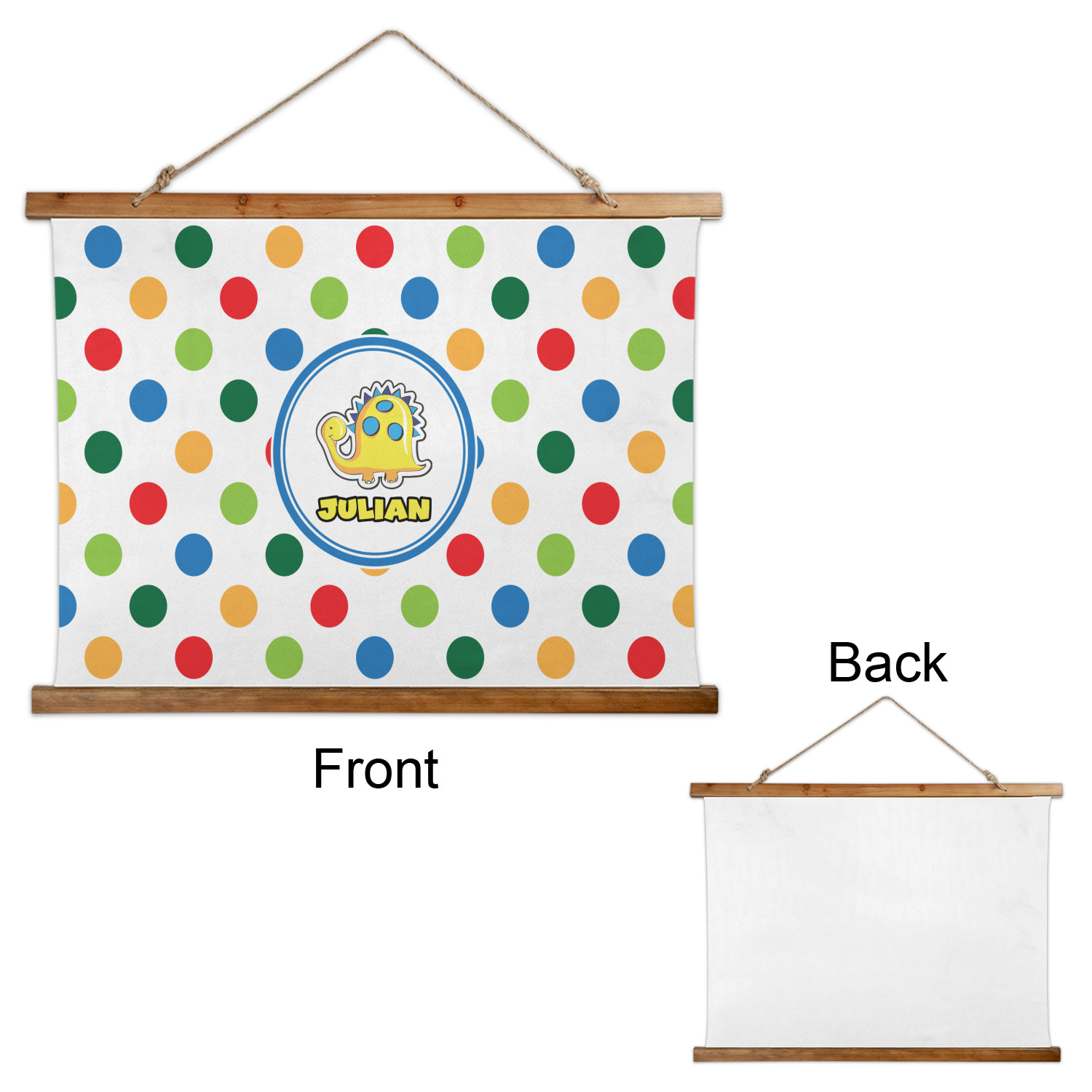 Made in two different orientations - portrait or landscape - both are 26" x 36". Your design is printed on a high quality polyester fabric with hemmed edges. The wood on the top and bottom of the tapestry is 1.25" tall and 0.25" thick and there are two pieces on top and bottom which sandwich the fabric.