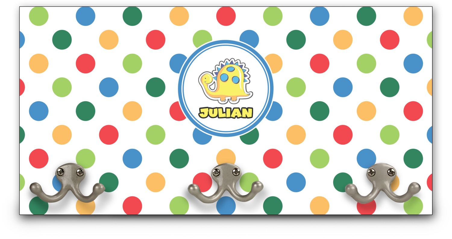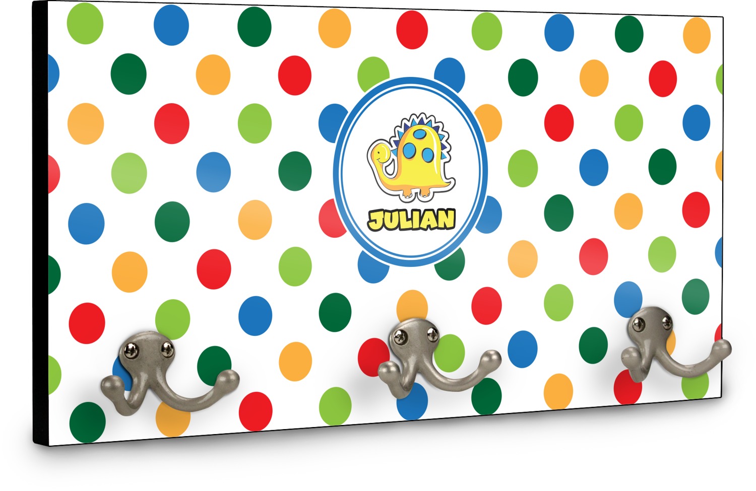 This coat rack is the perfect way to add some personality to your wall or entryway. The board is made of a strong maple that is approximately 16" x 8". The three 2-prong hooks are a sturdy metal that have three screws attaching them to the board. Your design is printed right onto the front of the board while the back and sides are a simple black.