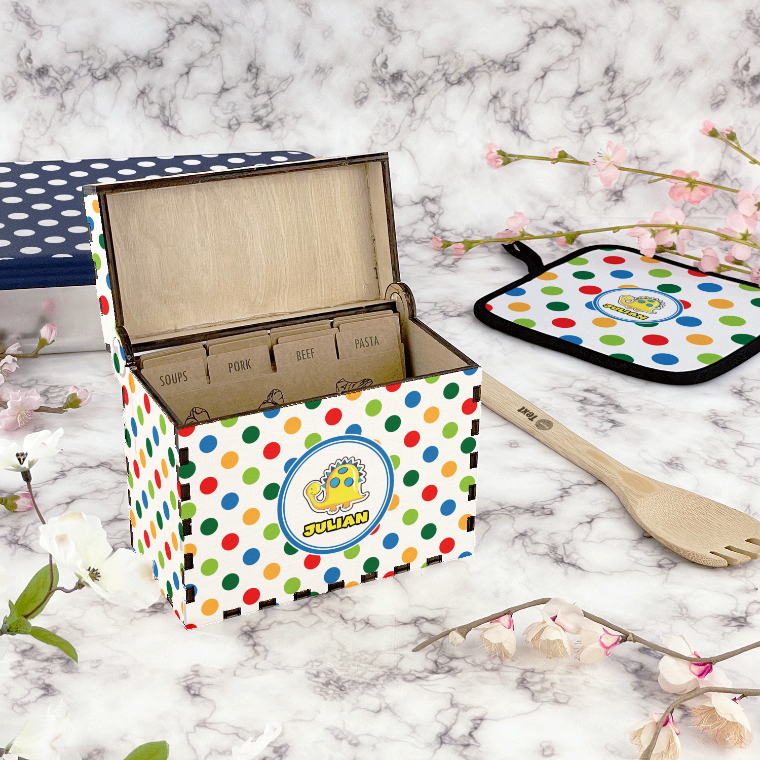For a classic look for your kitchen counter to hold all of your family heirloom recipes look no further than this full color printed wood recipe box. These recipe boxes are sure to add a nice custom touch to your kitchen and allow you to proudly display your treasured family recipes in a beautiful custom recipe box.