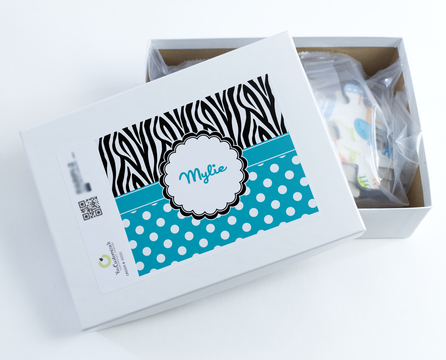 A white scalloped circle label edged in black highlights the personalization of your choice. A wide matching color band trimmed in white completes the design.
