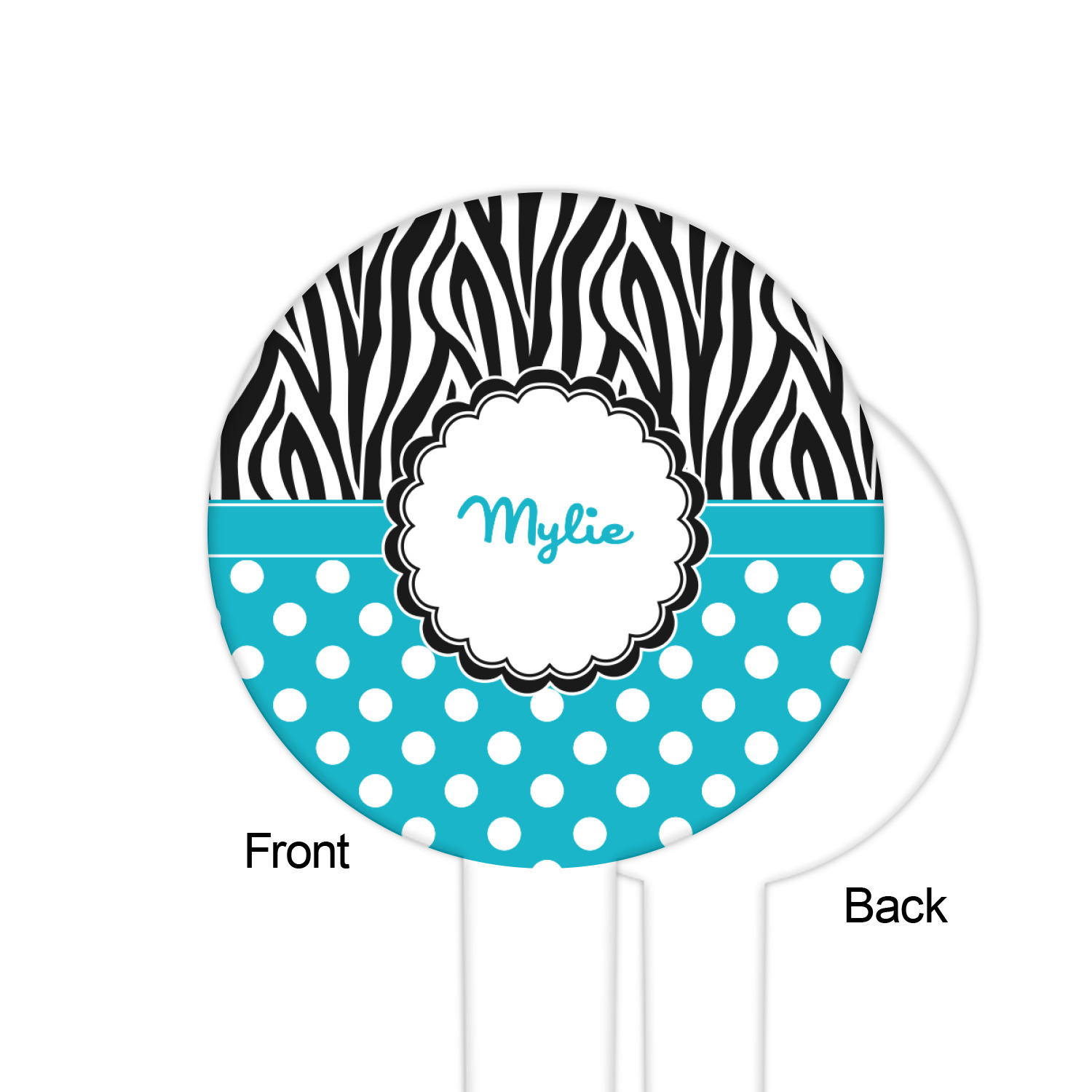 A white scalloped circle label edged in black highlights the personalization of your choice. A wide matching color band trimmed in white completes the design.