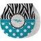 A white scalloped circle label edged in black highlights the personalization of your choice. A wide matching color band trimmed in white completes the design.