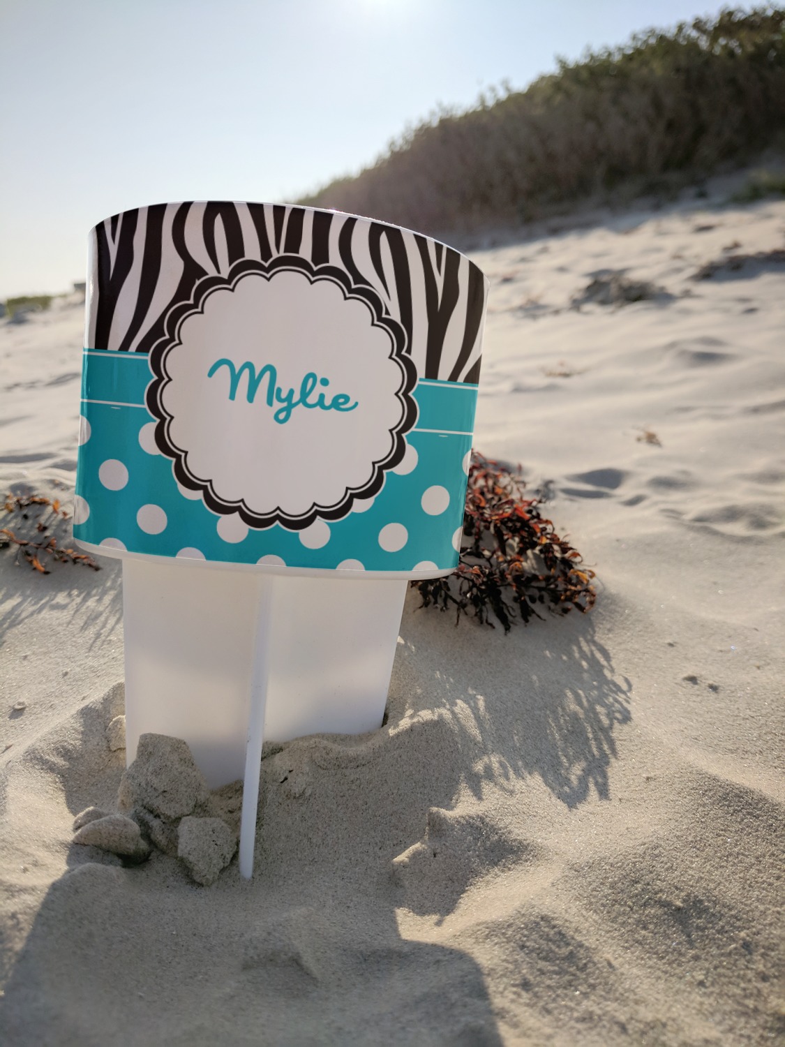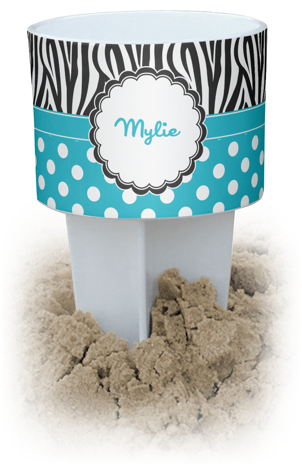 This cup holder has a large stake at its bottom that anchors it to the sand or ground below, while the cup holder rests above the stake. The entire drink holder is made of durable plastic and displays your customization around the cup holder portion. We sell these personalized beach spikers in two different colors: black and white.