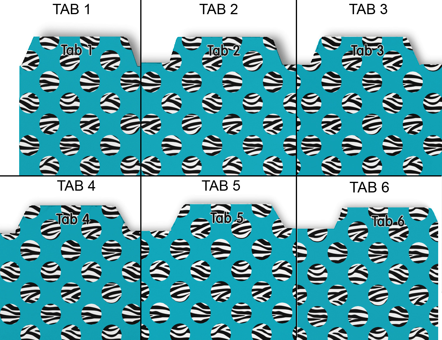 Whether you use binders at school or at work, we have designs to suit all of them. Available in 5 or 6 tab sets, you are sure to find a set to suit your needs. The back of each one is white and can be used to take notes, write vital information on, etc.