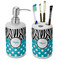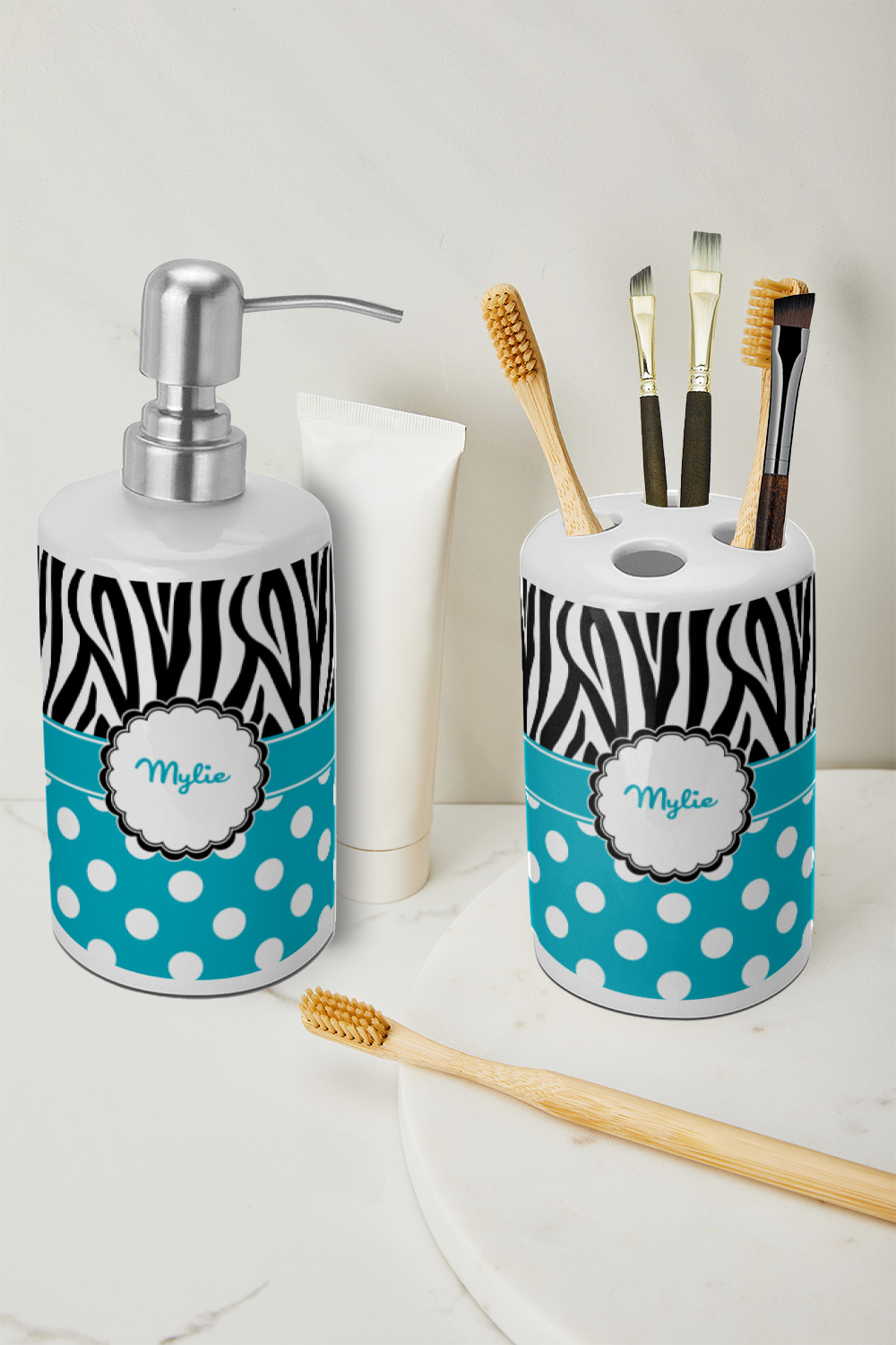 This two piece, ceramic bathroom set will add the perfect splash of color to any bathroom. This set includes one pump dispenser, ideal for soap or lotion, and one toothbrush holder with four holes. Although originally designed for toothbrushes, the holder will also hold make-up brushes, nail files, and other bathroom tools.