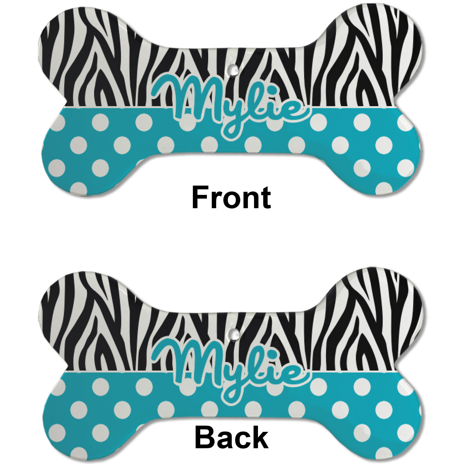 A white scalloped circle label edged in black highlights the personalization of your choice. A wide matching color band trimmed in white completes the design.