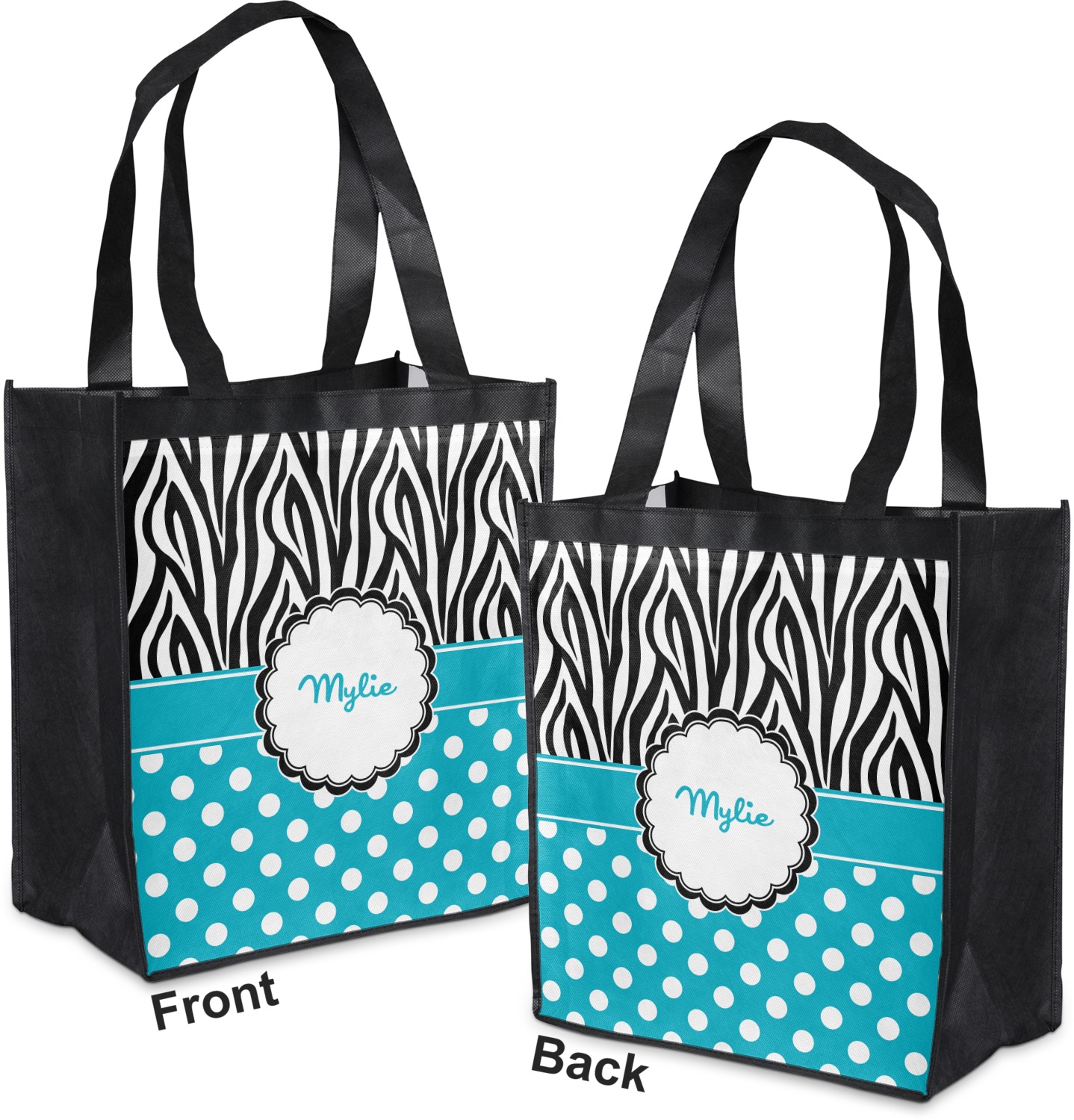 Made from a durable, biodegradable material, these reusable shopping bags can support up to 30 pounds of weight. With two large handles, measuring at 8.5 inches each, these personalized tote bags are easy to carry to your vehicle or home. The bag itself is 12 by 13.5 inches, and can expand to a depth of 7 inches. Your customization is printed on both the front and back, while the remaining sides, trim, and handle are a sleek, charcoal black.