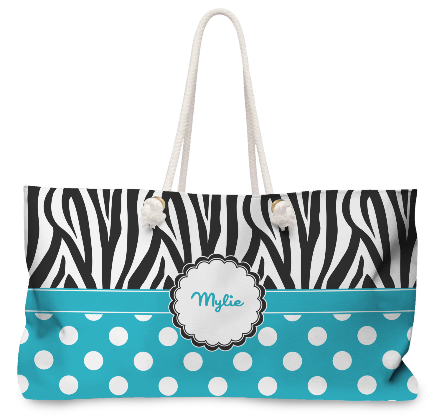 Our oversized weekender tote with rope handles is perfect for your weekend at the beach or on the town. This large tote are 24" W X 13" H, with a 5" gusset and a 27" thick rope handles with a knot that is put through a grommeted brass hole.