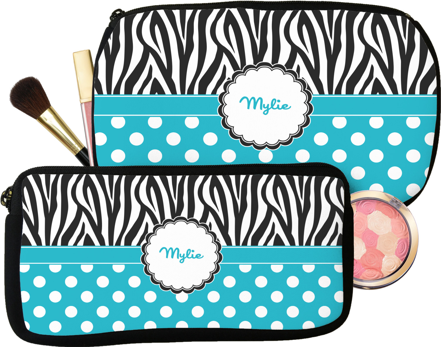 Our personalized makeup bags are available in many different designs, patterns and colors - so you are sure to find one that will love. They are made of neoprene (same material as wet-suits) and thus are water resistant, so spillages in your makeup bag will not end up all over you purse. They are customized on one side and are black on the other side and the zipper is black as well.