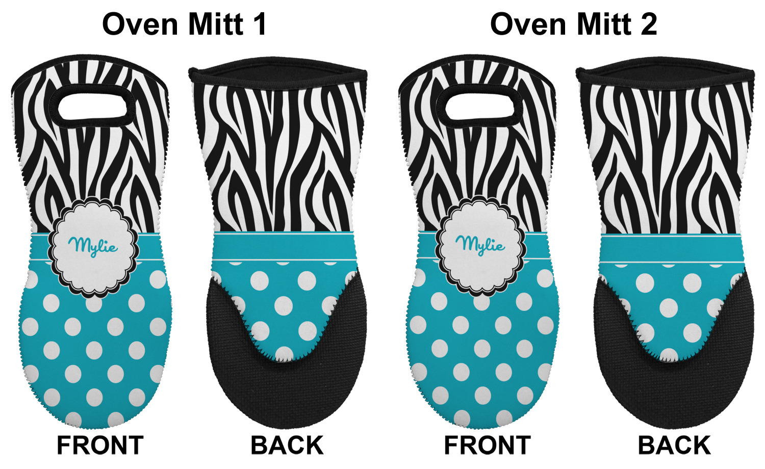 These heat resistant gloves are made entirely of a durable neoprene; the front features a softer texture, while the palm's side has a textured surface, meant to handle heat up to 500 degrees Fahrenheit. Thick, heavy duty stitching connects the two sides. A small, oval cutout appears on the front, and can be used to hang and store the mitt. Your personalization appears on the front, and the upper part of the back of the mitt. The style of these oven mitts are suitable for both the right and left hand, depending on your needs. If you need one for each hand, be sure to order two!