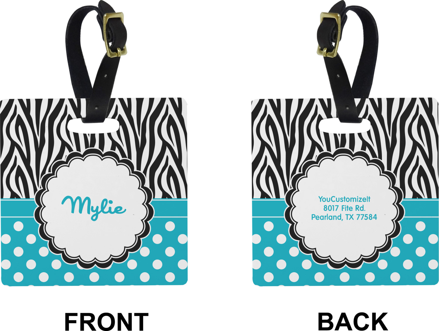These personalized bag tags are sold in a variety of shapes, so that you may find the product that meets your vision exactly. We sell a round luggage tag, which measures at approximately 4" x 4". Our square luggage tag is about 3.5" x 3.5", while our rectangular version is 2.75" x 4 ".
