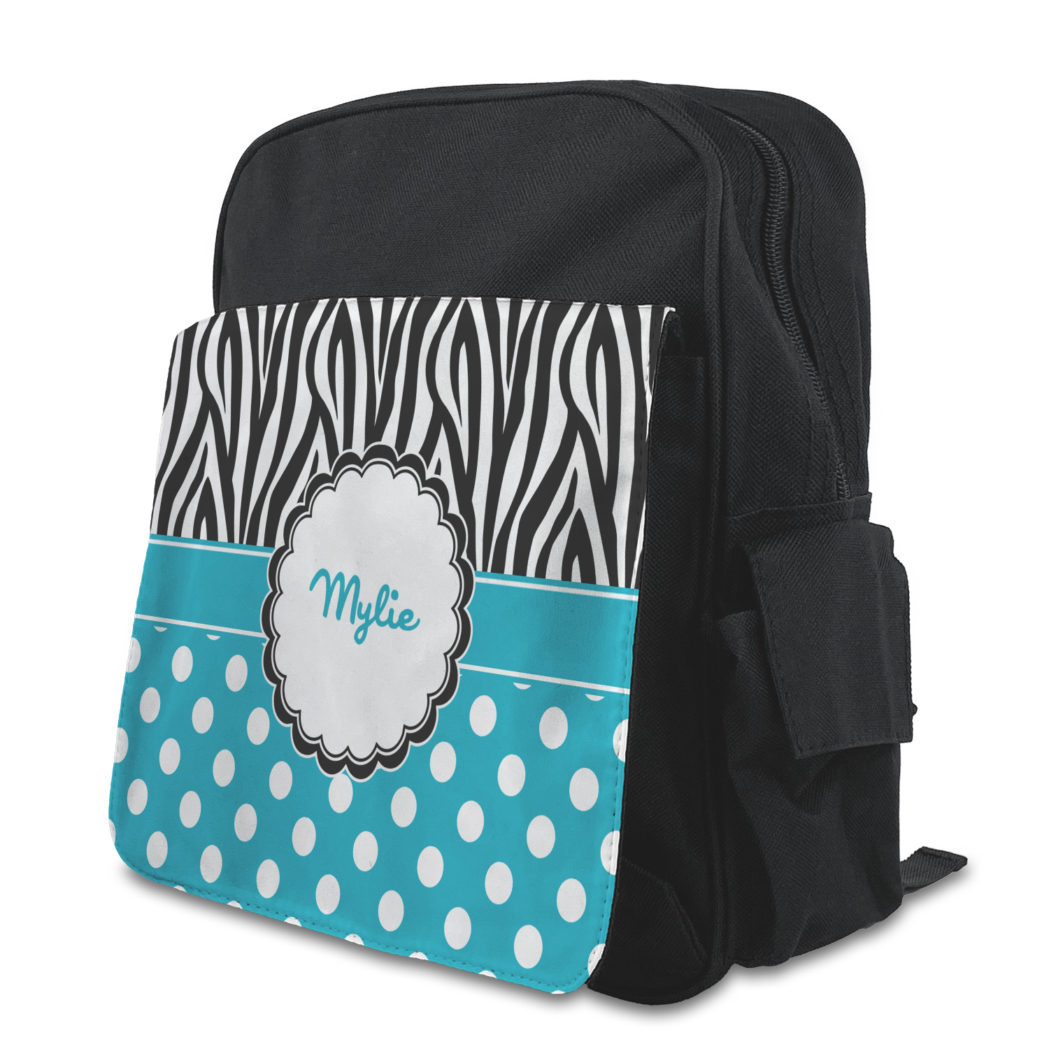 The backpack is a small size perfect for toddlers up to Kindergarten age. The zipper main pouch can hold most of their items and they have one side pocket with a flap to close it and the other side has a mesh pocket perfect for a water bottle. The outside has a customizable flap with a smaller pouch to hold more items. The straps are adjustable to fit your toddlers shoulders and they have a loop on top for hanging for storage.