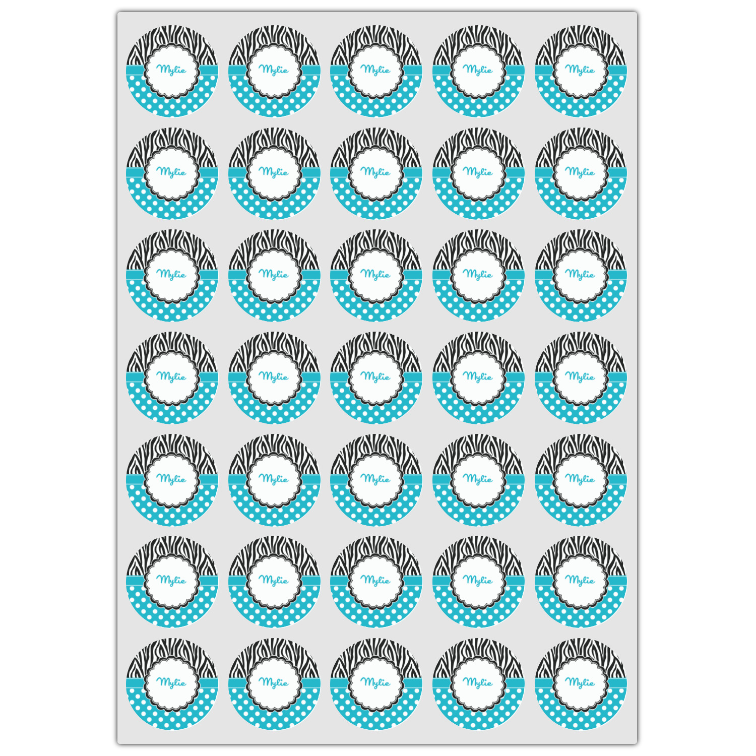 A white scalloped circle label edged in black highlights the personalization of your choice. A wide matching color band trimmed in white completes the design.