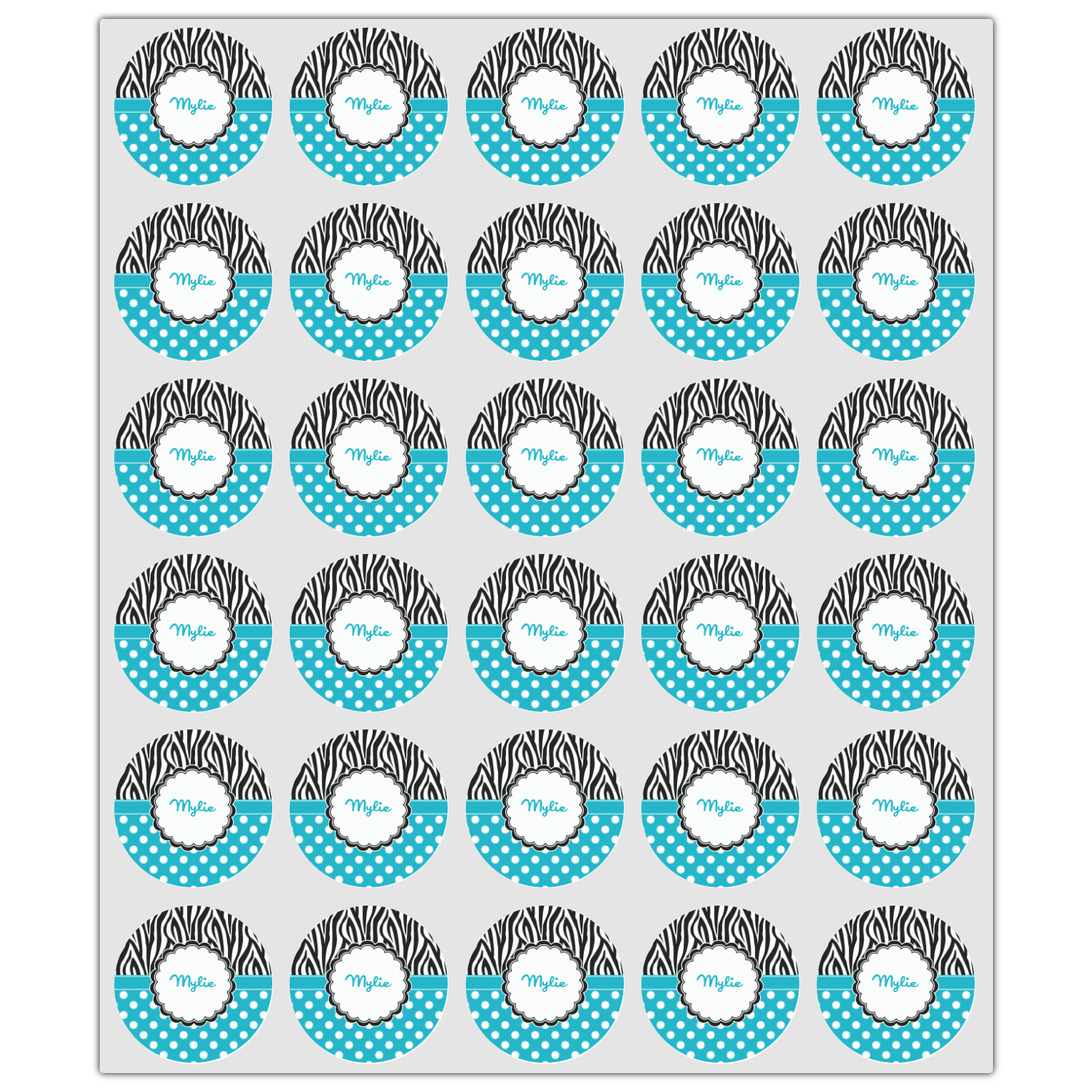 A white scalloped circle label edged in black highlights the personalization of your choice. A wide matching color band trimmed in white completes the design.