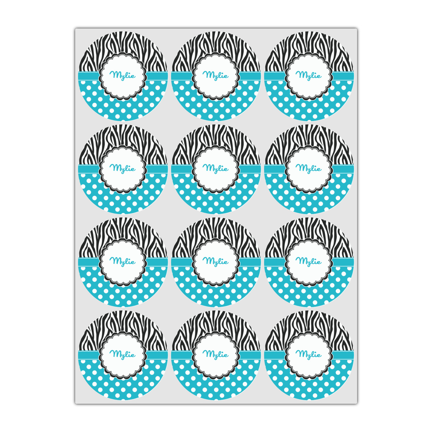 A white scalloped circle label edged in black highlights the personalization of your choice. A wide matching color band trimmed in white completes the design.