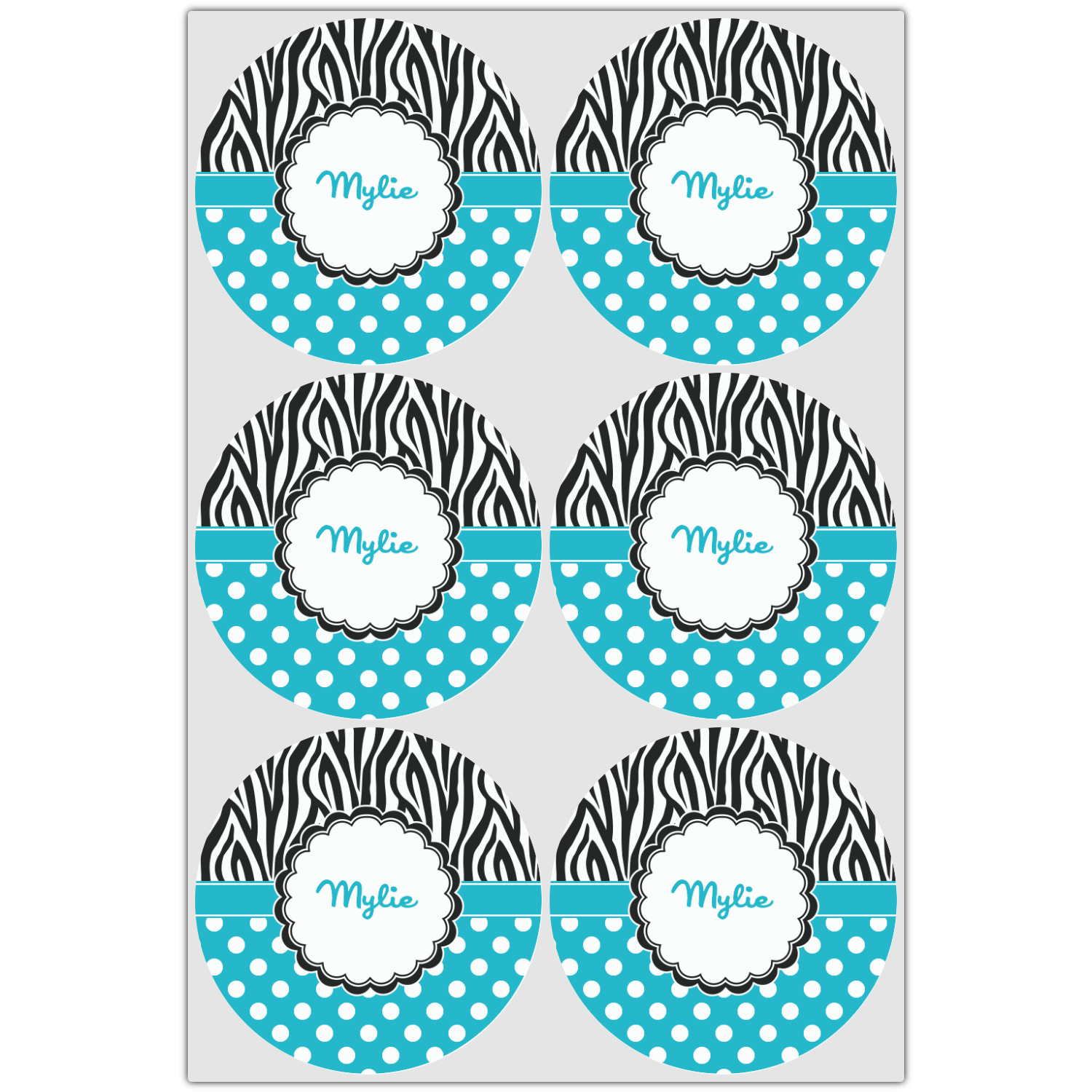A white scalloped circle label edged in black highlights the personalization of your choice. A wide matching color band trimmed in white completes the design.