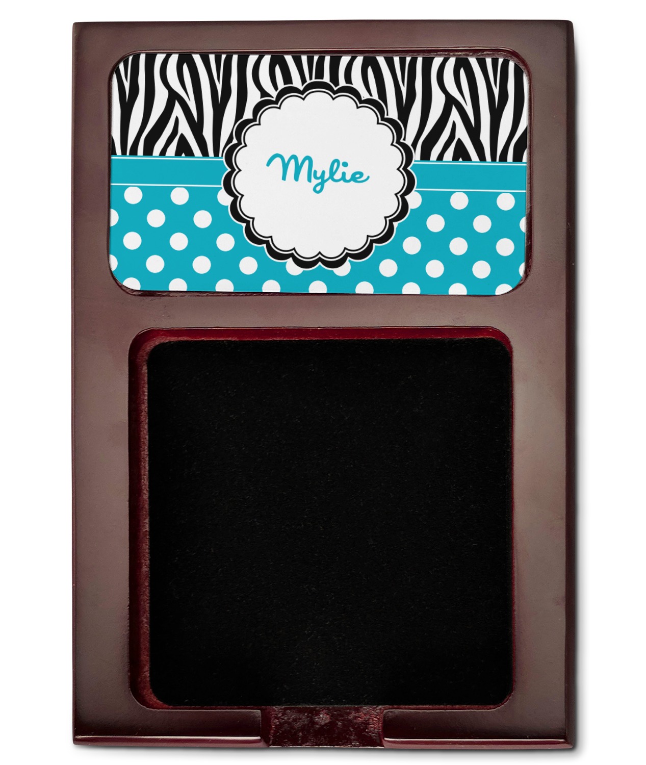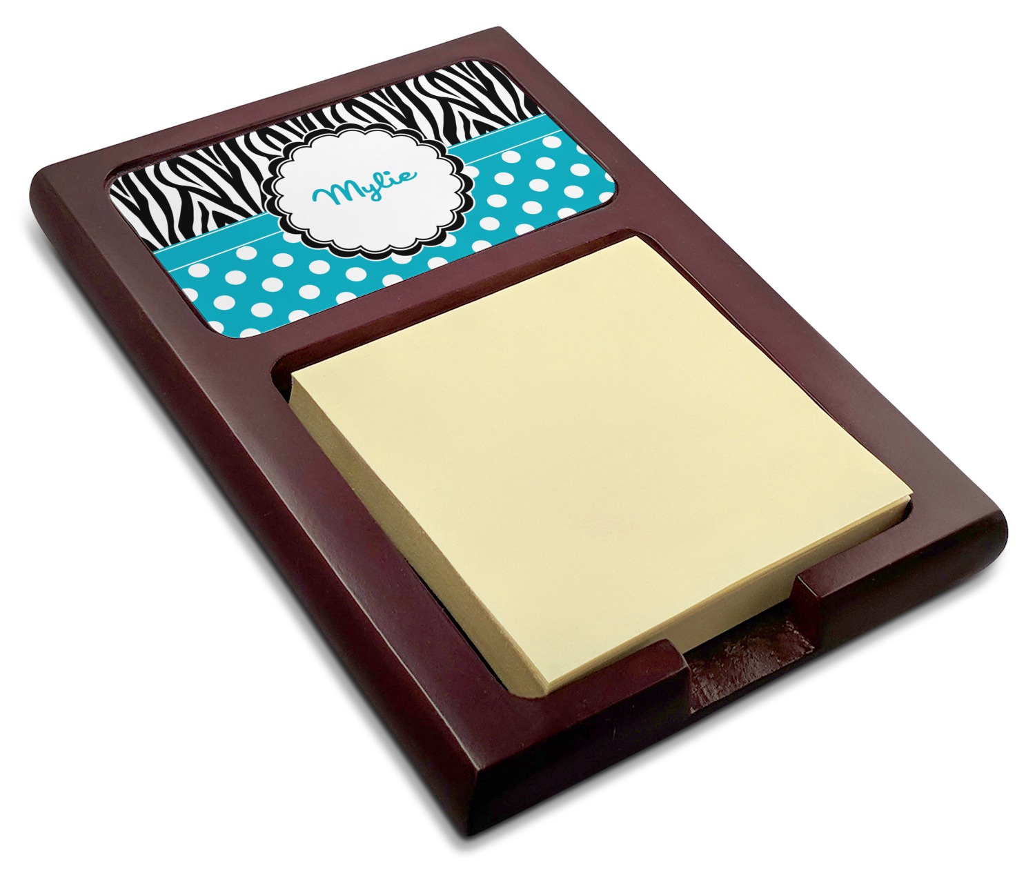 Crafted from a fine mahogany, this post it note holder is in the shade of a dark, cherry color. The dispenser itself is about 4.25 by 6.25 by 0.75 inches. You can place your 3 by 3 inch sticky notes in the indentation below the nameplate. We print your customization onto the nameplate that rests above the velvety indentation.