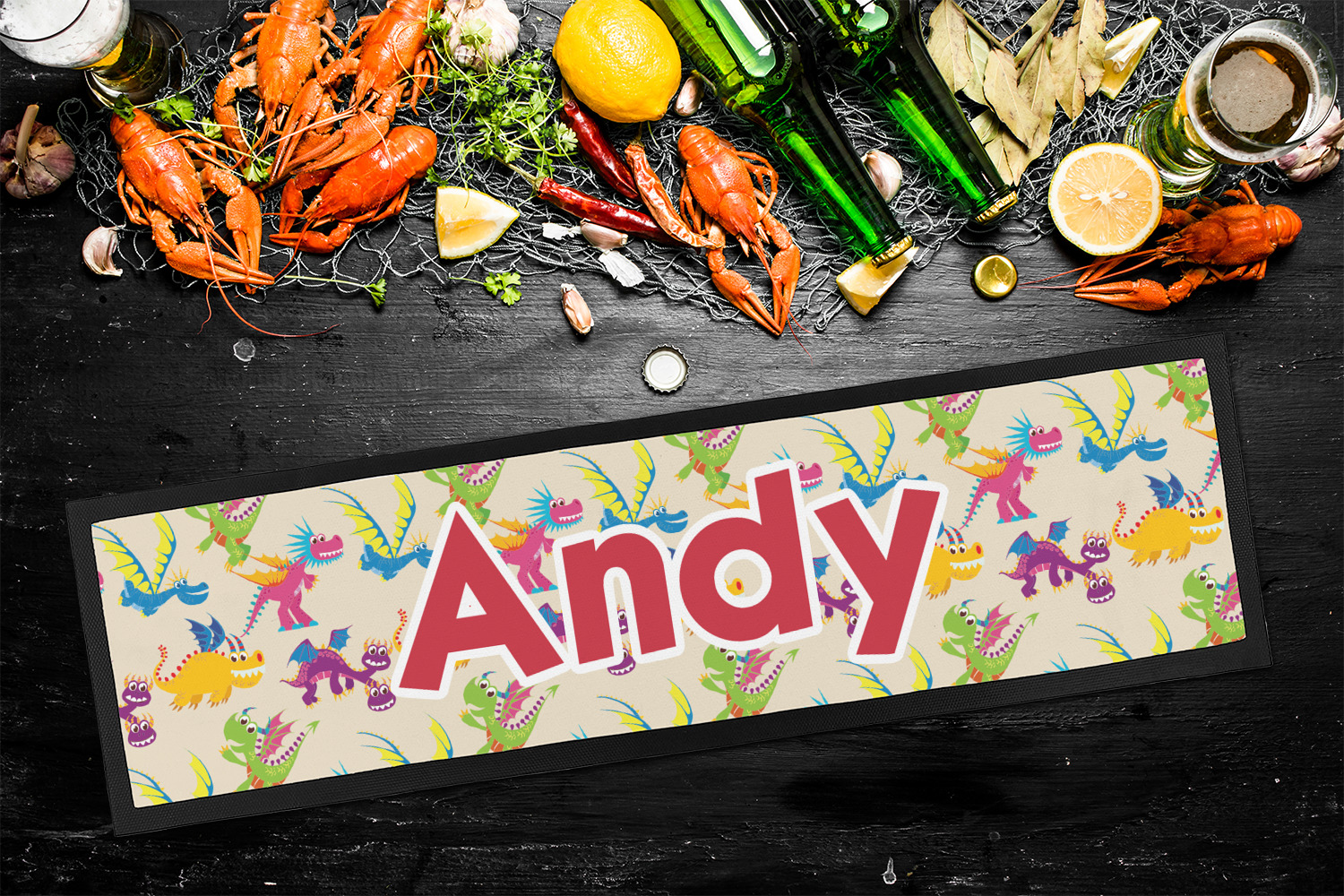 Dragon slayers unite! This little guy is going to be busy conquering all these dragons this print has to offer. Blue, green, yellow, purple, and even pink dragons of all shapes and sizes are the highlight of this design. With the variety of colors that pop on the black background decorating with be a breeze.
