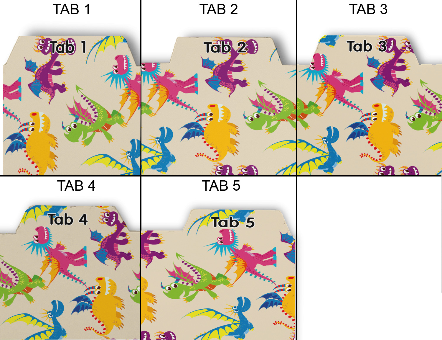 Whether you use binders at school or at work, we have designs to suit all of them. Available in 5 or 6 tab sets, you are sure to find a set to suit your needs. The back of each one is white and can be used to take notes, write vital information on, etc.
