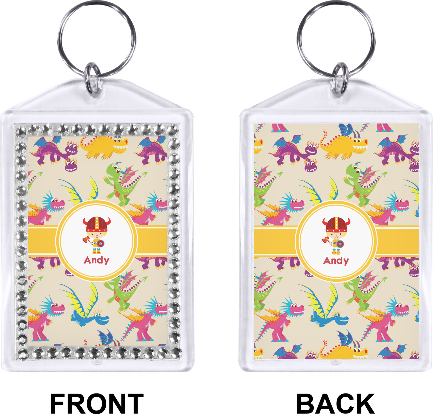 Our personalized keychains have a bold, rectangular shape, outlined by a series of shimmering rhinestones. A metal, split keyring is included with your purchase, and an additional metal hoop allows for attachment of the keychain to the split ring. This unique keychain measures at about 3.75 by 2.5 inches. We print your customized design(s) across both the back and front of this keychain.