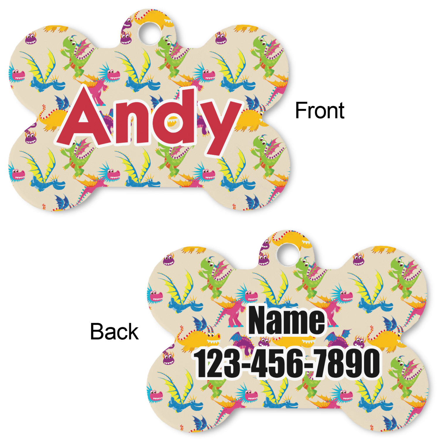 Our default design templates print your dog's personalization on the front and your contact information on the back; however everything is customizable, so you customize the patterns, the colors, the personalization, the contact information etc.