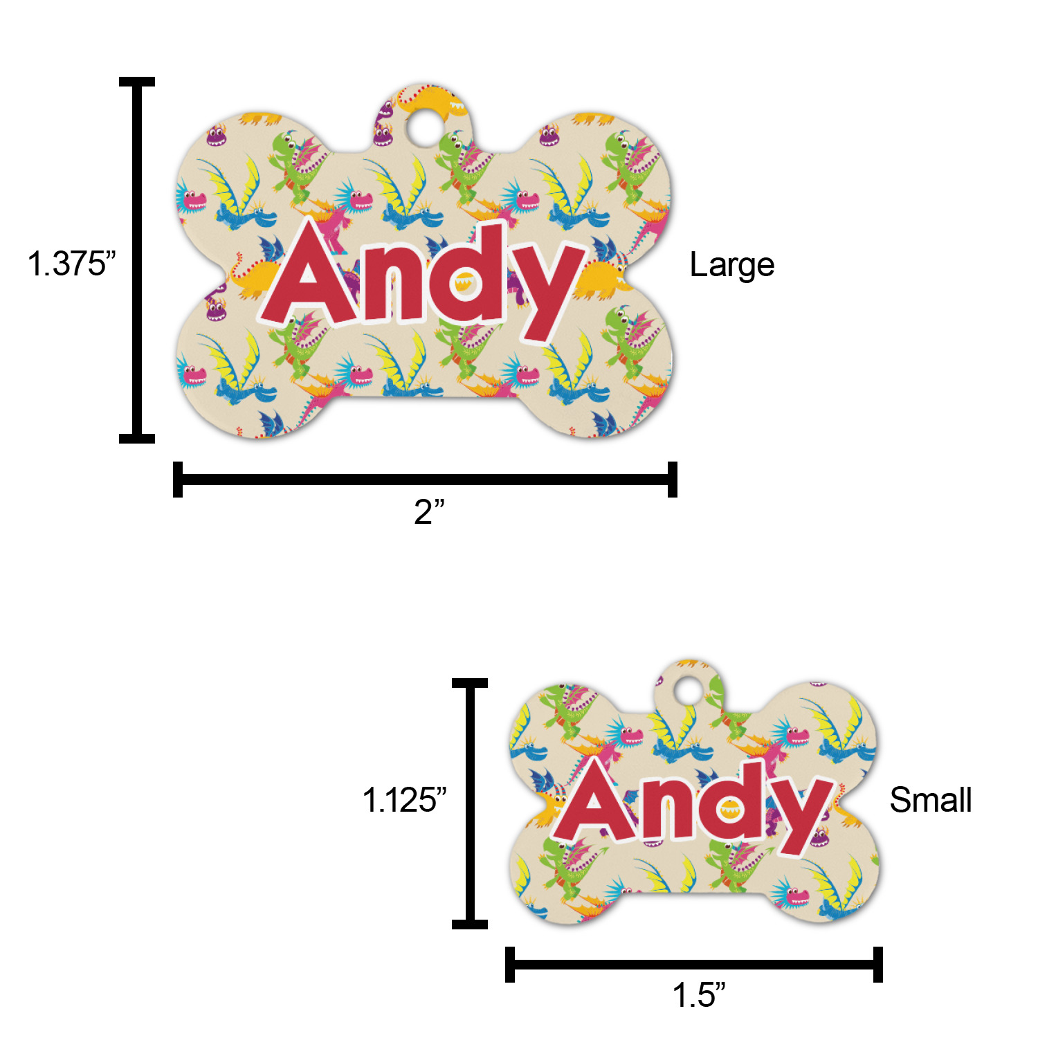 The small bone dog tag size is perfect to pair with our small dog collars, the large size pairs well with our large dog collars.