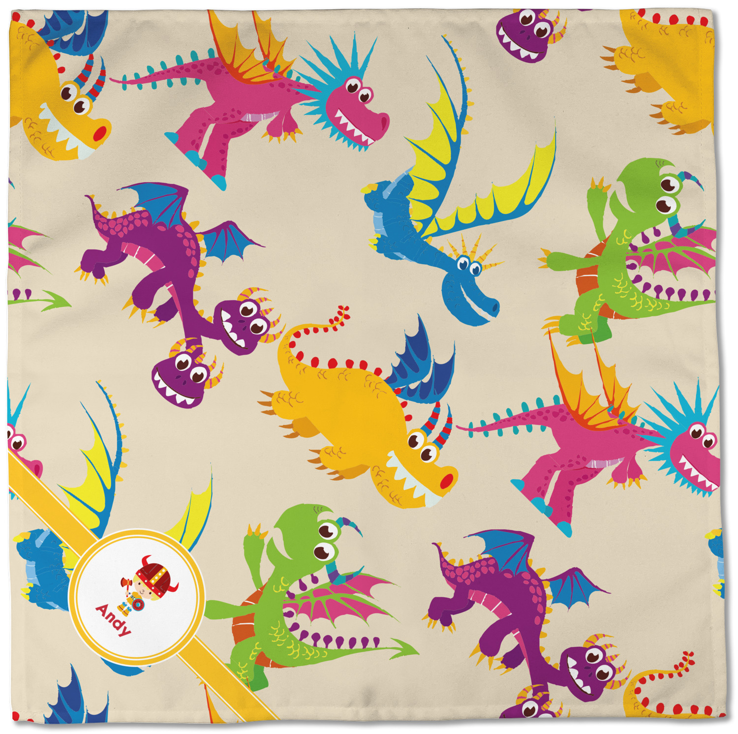 Dragon slayers unite! This little guy is going to be busy conquering all these dragons this print has to offer. Blue, green, yellow, purple, and even pink dragons of all shapes and sizes are the highlight of this design. With the variety of colors that pop on the black background decorating with be a breeze.