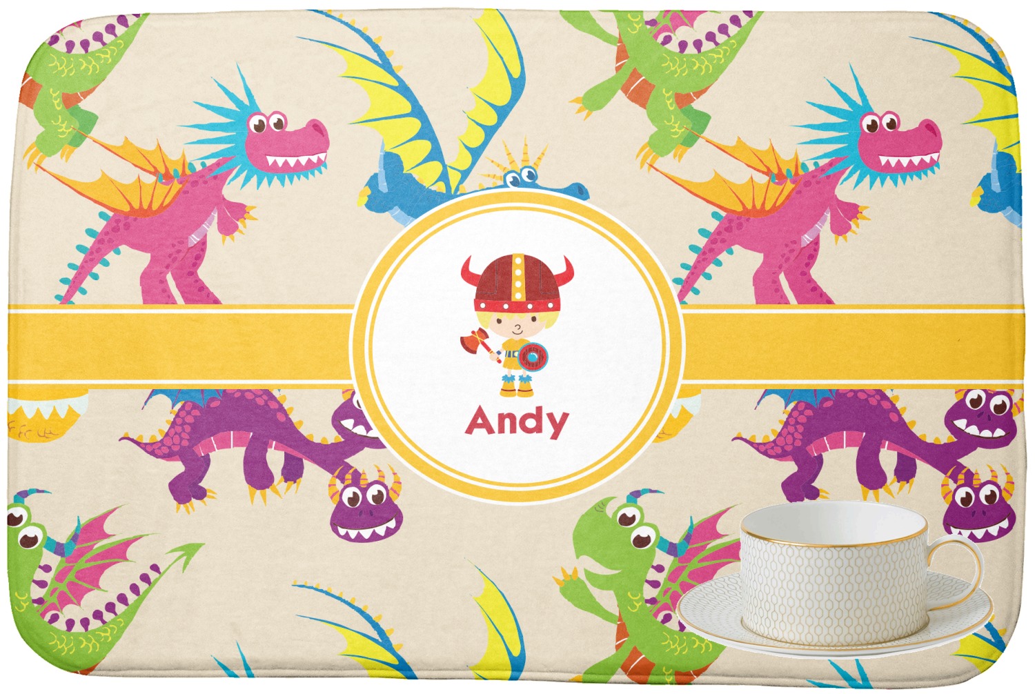 A white outlined yellow band with a yellow circle label highlights the little dragon slayer. Change the hair color to match your little guy and add his name to make this a fun design for all dragon lovers.