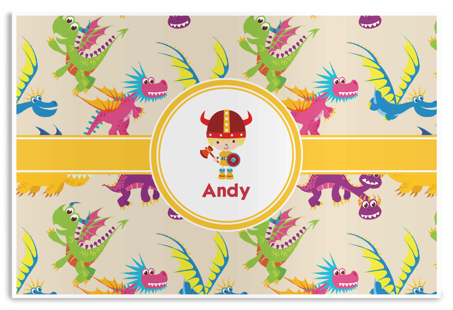 A white outlined yellow band with a yellow circle label highlights the little dragon slayer. Change the hair color to match your little guy and add his name to make this a fun design for all dragon lovers.