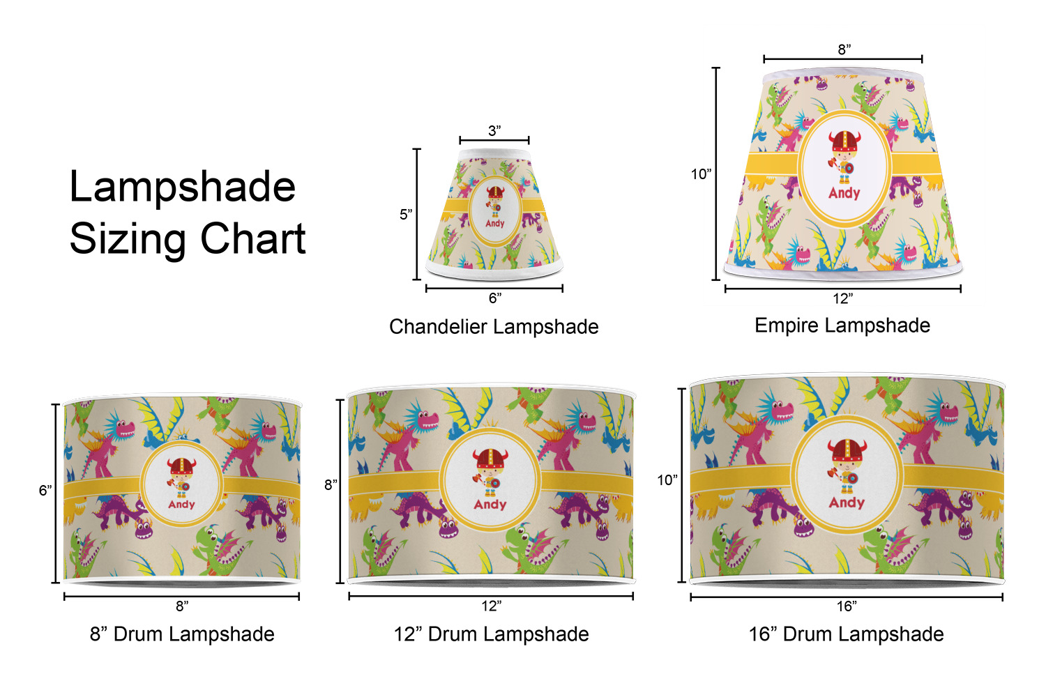 Our customized lamp shades also come in 3 different sizes: 8", 12" and 16", measuring at 8" in diameter by 6" tall, 12" in diameter by 8" tall, and 16" in diameter by 10" tall, respectively.