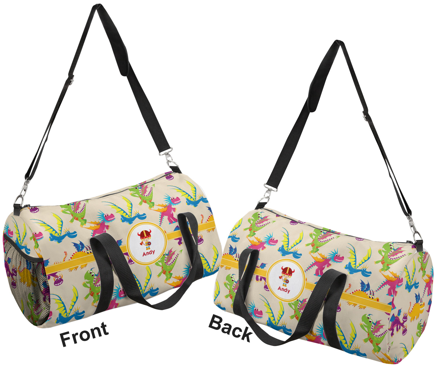 This duffle is a sturdy bag made of a canvas material. It comes in two sizes: Small (19"W x 9.5"H x 9.5"D) and Large (23"W x 12"H x 12"D). The bag is a cylindrical shape with a black adjustable strap and two handles. On one side is an elastic pouch to put a waterbottle or other small item. Your product will be sublimated with your design and is able to be designed on the front, back, and sides. Be sure to remember that the straps may cut into parts of your design if you upload your own artwork.