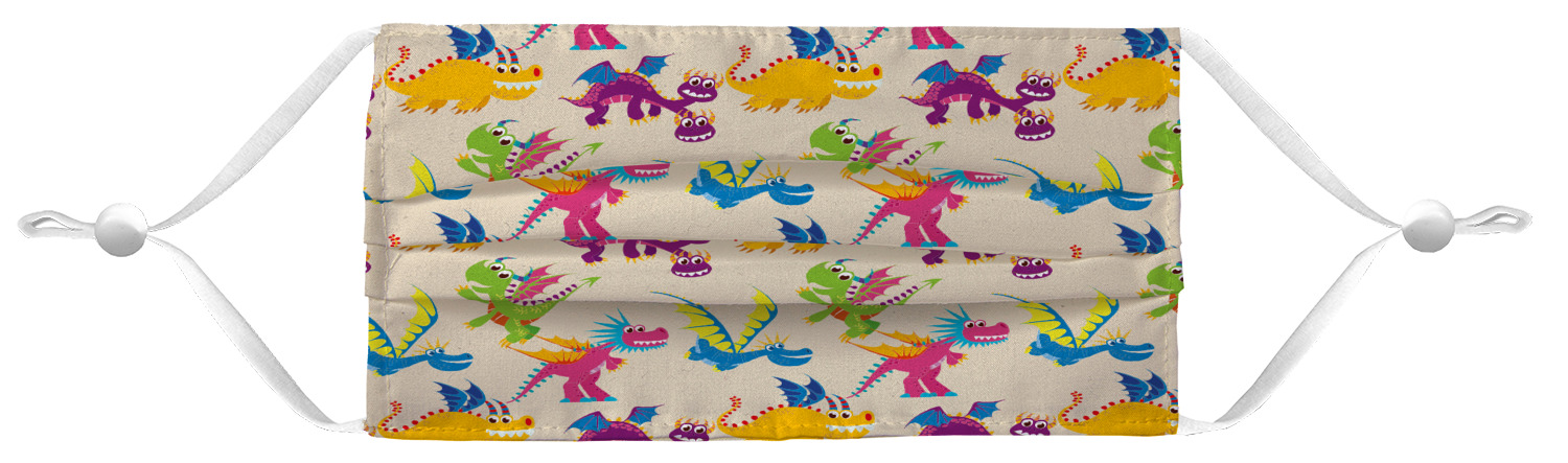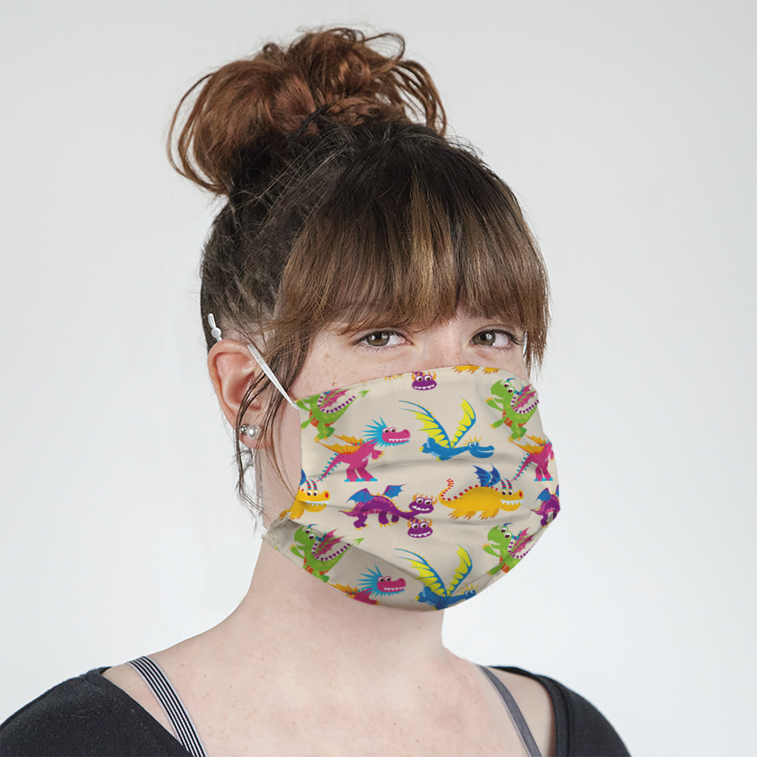 These fun face masks are 7" wide and 3.5" high. They feature pleats, adjustable ear loops, and are made with two layers of fabric. The top layer where your design is printed is a breathable polyester sheeting, while the inside layer is a soft microfiber polyester