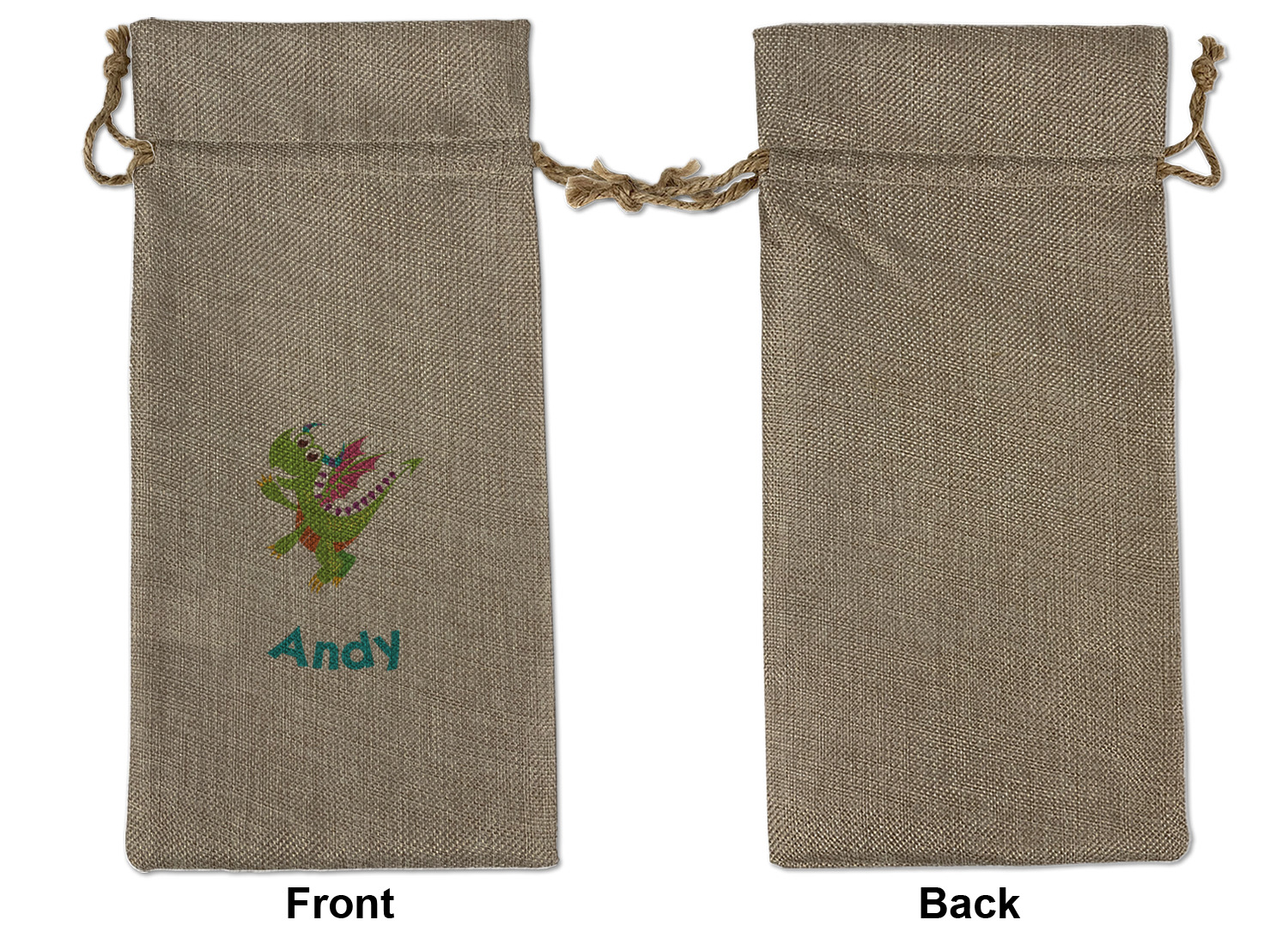 We sell our Burlap Gift Bags in 3 variant sized bags. Made with burlap polyester, each personalized bag can be secured with a twine drawstring pull. Your custom design is available to print on one side or both sides - completely up to you! The sizes of the bags measure approximately 4.5" x 6.5" for the smallest size, 6.5" x 8.0" for the medium size, and 6.5" x 13.5" for the large-sized bag.
