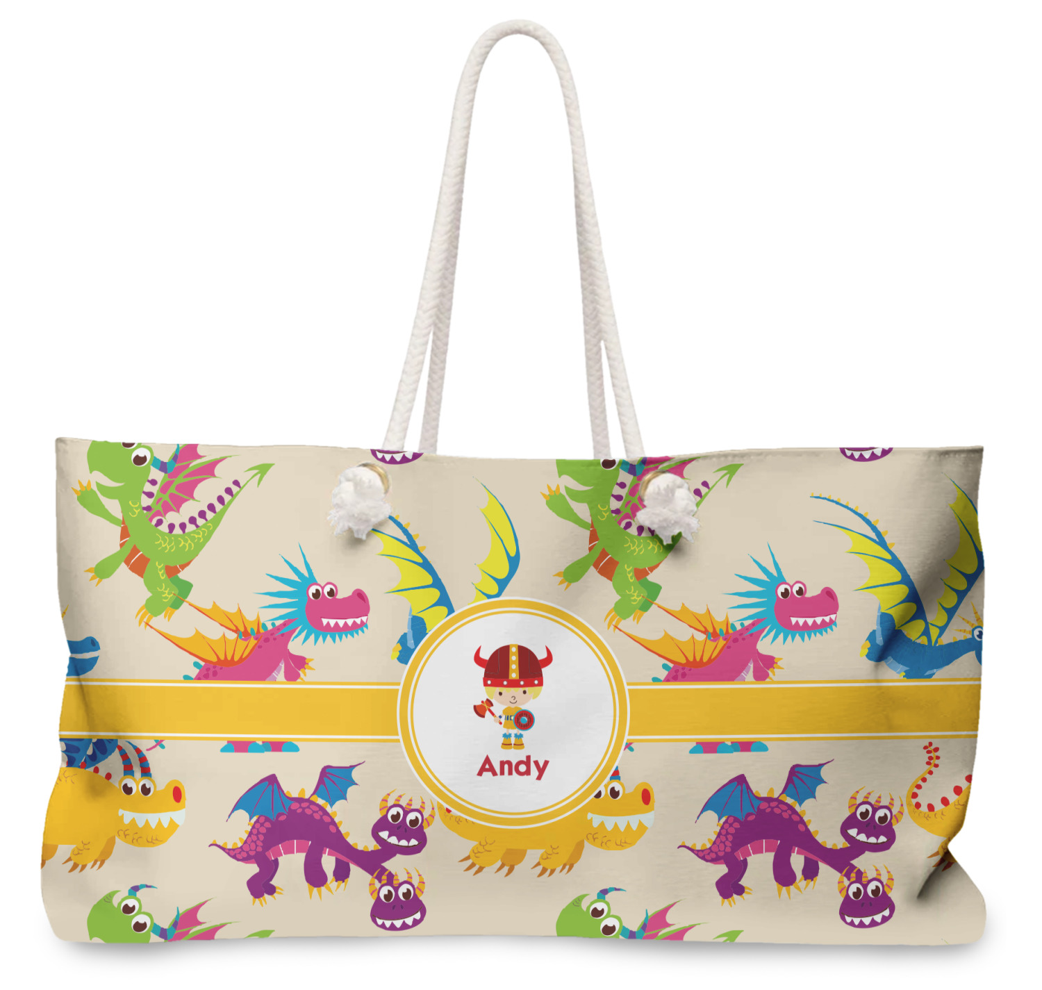 Our oversized weekender tote with rope handles is perfect for your weekend at the beach or on the town. This large tote are 24" W X 13" H, with a 5" gusset and a 27" thick rope handles with a knot that is put through a grommeted brass hole.