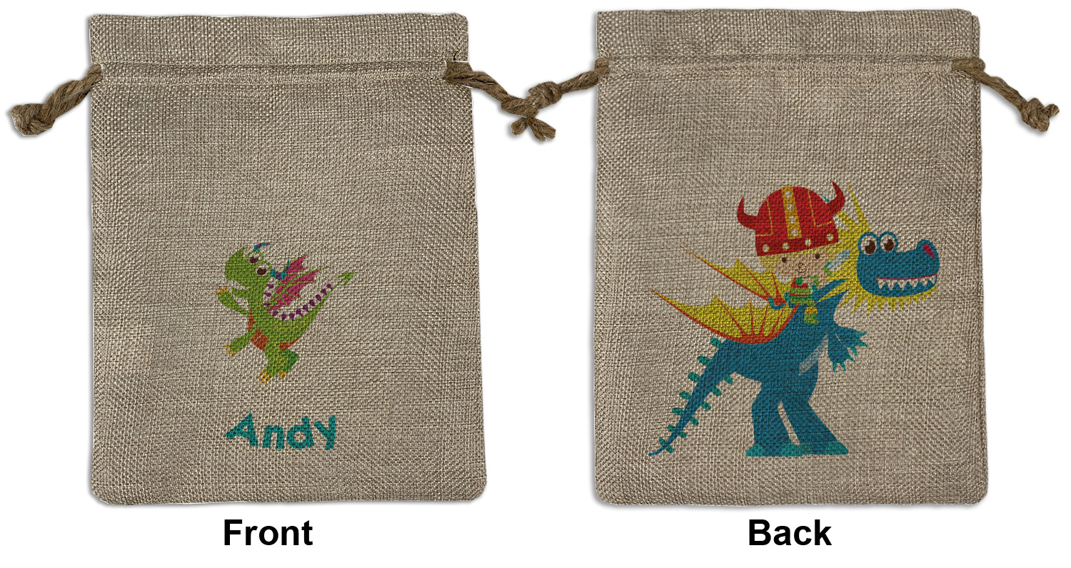 We sell our Burlap Gift Bags in 3 variant sized bags. Made with burlap polyester, each personalized bag can be secured with a twine drawstring pull. Your custom design is available to print on one side or both sides - completely up to you! The sizes of the bags measure approximately 4.5" x 6.5" for the smallest size, 6.5" x 8.0" for the medium size, and 6.5" x 13.5" for the large-sized bag.